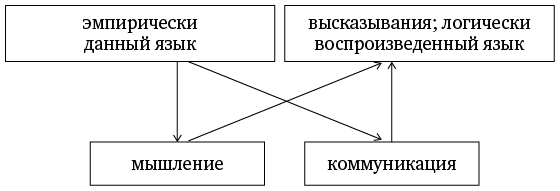Процесс исследования эмпирически данного языка в соответствии с общими принципами развития знания шел таким образом, что сначала были выявлены и зафиксированы в эмпирической форме закономерности высказываний. В этих закономерностях было смешано или, вернее, еще не было отделено все: некоторые закономерности и стороны мышления, некоторые закономерности и стороны процессов коммуникации, некоторые стороны языка как такового. Это и была формальная логика. В настоящий момент задача состоит в том, чтобы отделить процессы мышления и процессы коммуникации друг от друга, исследовать то и другое по отдельности, а затем путем восхождения построить науку о высказываниях.