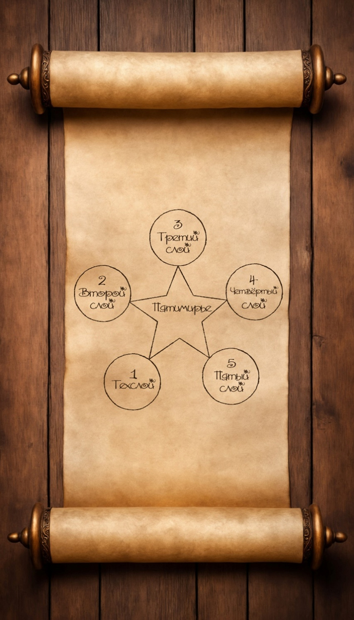 – Вот, смотри – каждый кружок на каждом из лучей звёздочки – слой. Ты это назвала параллельным миром, их пять. Ты пришла отсюда – со Второго слоя. Как видишь, тут есть ещё три кружочка. Мы сейчас на Первом слое, он же Технический.