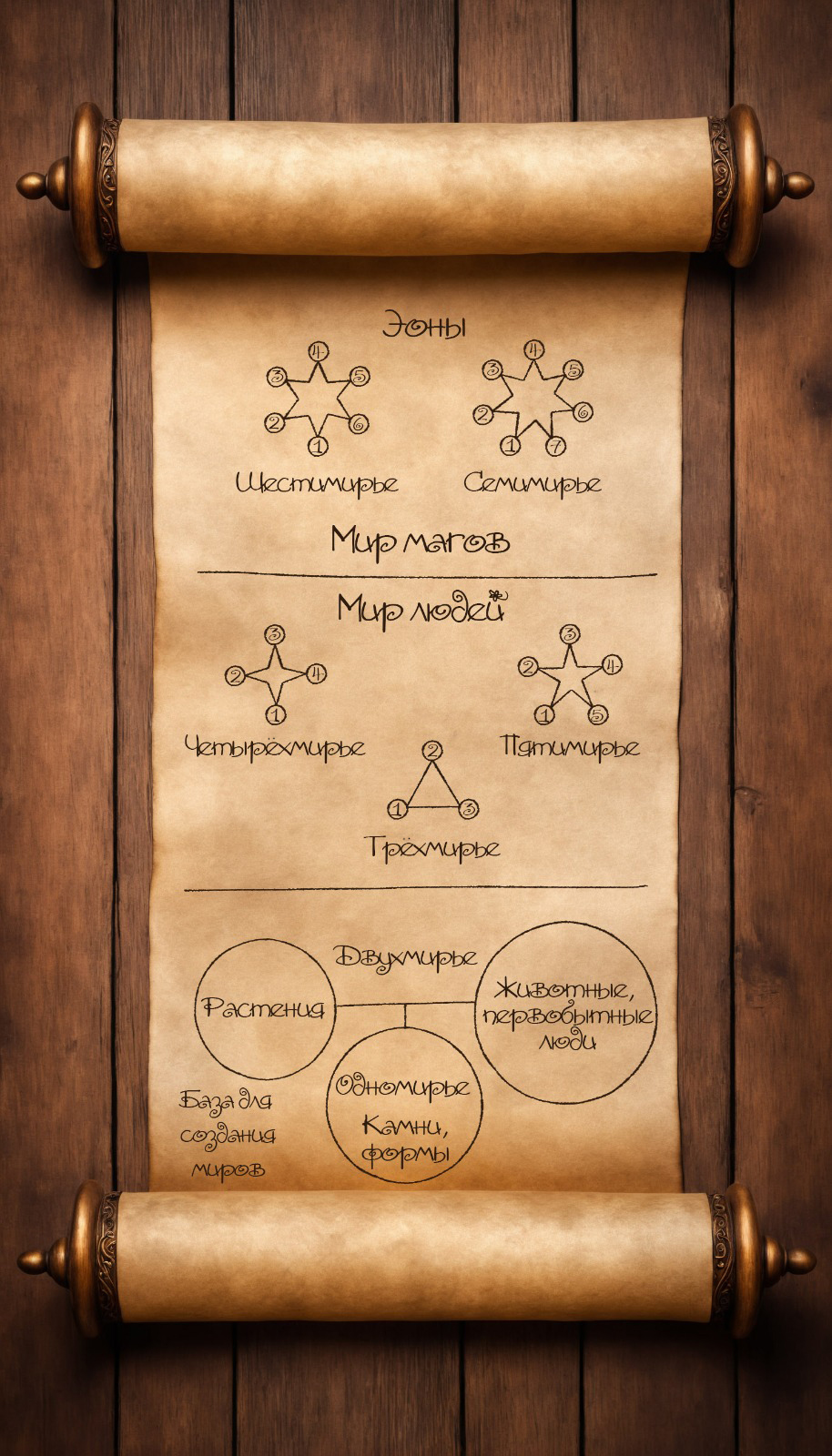 – Там миры, похожие на наши, только проще, примитивнее. Там люди только начали развиваться. В Трёхмирье первобытно-общинный строй, начиная с каменного века, на всех трёх слоях разные эры. В Четырёхмирье уже поинтереснее: античность, феодалы, средневековье есть, четыре слоя.