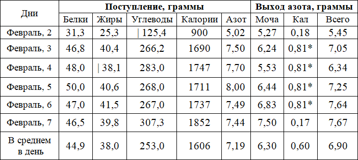 В следующей таблице указано суточное потребление белков, жиров и углеводы в течение шести дней вместе с расчетной топливной ценностью, а также потребление азота вместе с выходом азота через экскременты. Было получено много других данных, свидетельствующих о снижении экскреции. мочевой кислоты, эфирных сульфатов, фосфорной кислоты и других веществ, но они здесь не обсуждается.