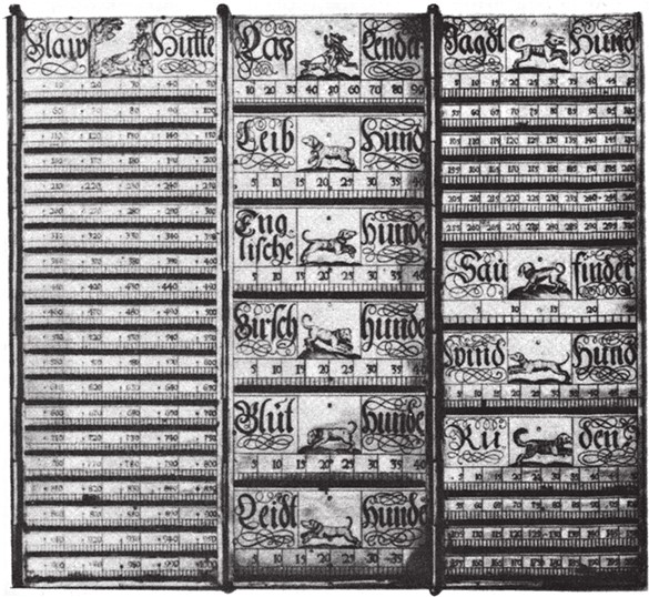Любопытную группу образуют охотничьи сабли, украшенные специальными счетными таблицами. Неизменным компонентом любой охоты было соревнование в количестве убитой дичи и величине пораженных животных, поэтому велись самые тщательные подсчеты. В Британском музее хранится исключительный образец немецкого охотничьего меча с календарем и счетчиком. Он состоит из восьми медных, прикрепленных на шарнирах страничек, большинство из которых посвящены определенным разновидностям охоты – на обыкновенного оленя, кабана, вожака стаи и т. д.