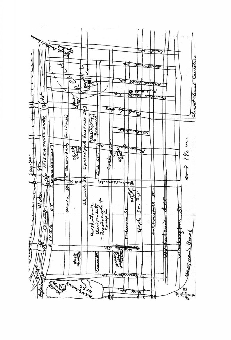 На следующем рисунке: Карта главной части Аркхема, шт. Массачусетс. Нарисована Г. Ф. Л. в начале 1934 г. Впервые опубликована в фэнзине The Acolyte, Vol. 1, No. 1.