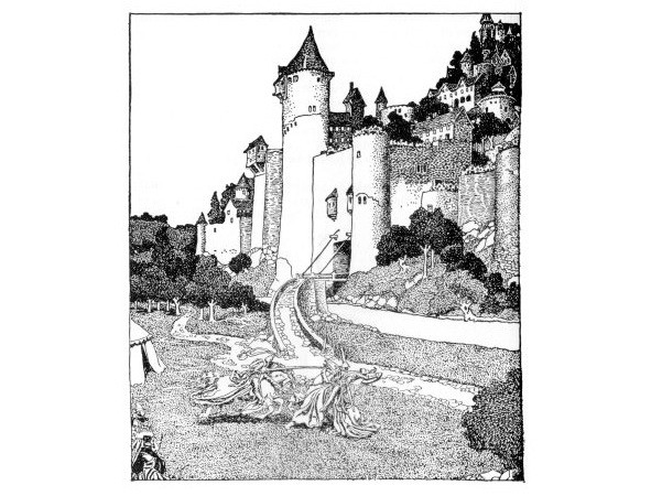 Он насмехался над ними в своей гордыне, и никто не осмеливался выступить против него из Камелиарда. Ибо герцог Нортумберлендский был одним из самых знаменитых рыцарей своего времени, человеком необычайной силы и успеха в военном деле, и теперь, в эти мирные времена, при дворе короля Леодегранса не было никого, кто был бы способен противостоять воину с его признанным мастерством и доблестью. Поэтому никто так и не принял вызов, который герцог Нортумберлендский бросил двору Камелиарда. Тем временем многие горожане собрались на стенах Камелиарда и смотрели оттуда на этого гордого и надменного герцога, облаченного в великолепные доспехи, и все они были опечалены и пристыжены тем, что в этом мирном городе не было никого, кто мог бы выступить против него. Все лорды и рыцари двора короля Райенса пришли и встали перед королевским шатром, смеялись, хлопали в ладоши, и приветствовали герцога Нортумберлендского, пока он так скакал взад и вперед перед ними. И чем больше их переполняло веселье, тем больше смущались жители Камелиарда.