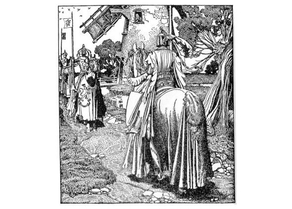Король Артур встречает двух рыцарей у ветряной мельницы.