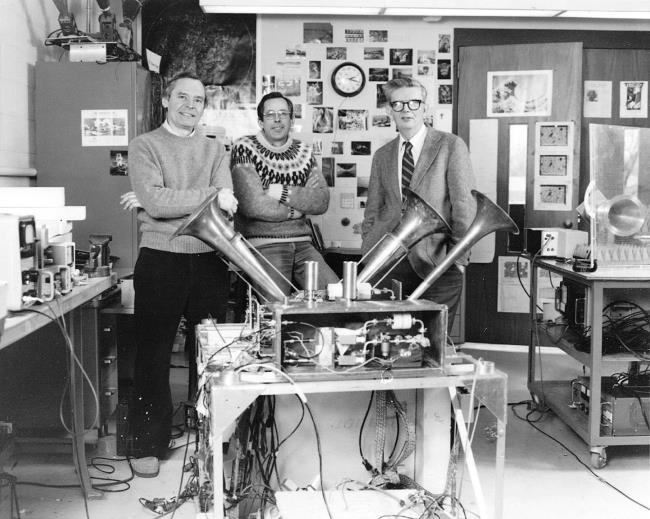 Дэвид Уилкинсон (слева), Джеймс Пиблс (в центре) и Роберт Дикке (справа) в начале 1960-х годов рядом с созданным ими радиометром для исследования фонового реликтового излучения