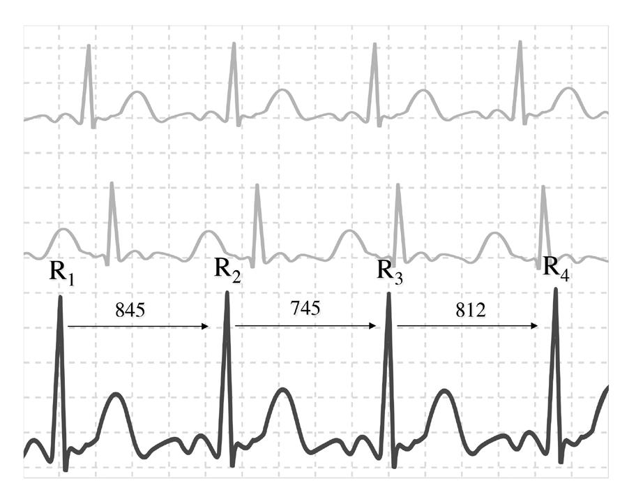 Рис. 5.3. Фрагмент обычной ЭКГ, где показаны повторяющиеся пики и снижение нормального сердцебиения. Расстояние от одного пика (R1) до следующего (R2, R3 и так далее) изменяется от одного удара к другому. Именно вариабельность сердечного ритма дает нам жизнестойкость. Источник: Dreamstime ® Z_i_b_i.