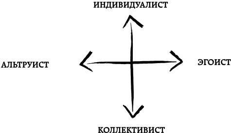 Любого человека можно описать как матрицу с двумя осями. (Рисунок 1.1). По горизонтали измерение идет от «Эгоиста» до «Альтруиста», по вертикали – от «Индивидуалиста» до «Коллективиста».