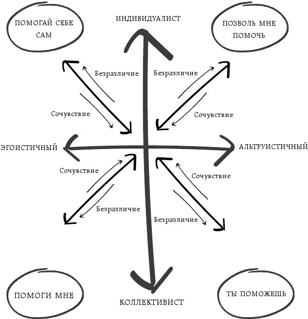 Не понимая наше влияние на других людей, мы не можем им сочувствовать и постепенно перемещаемся к одному из углов матрицы. Например, я – эгоистичный индивидуалист, и для меня это лучший способ движения вперед. Я считаю, что человек лучше справляется с задачами, соответствующими его идеям и ценностям, но сочувствую тем, кто поздно стартовал, споткнулся или просто старался, но потерпел неудачу. Один из моих близких друзей тоже эгоистичный индивидуалист, но придерживается другого мнения. Он уверен, что упавший не нуждается в сочувствии и должен встать на ноги сам. Хотя мы находимся в одной ячейке, согласно матрице, я оказываюсь ближе к центру, а мой друг – к одному из ее углов.