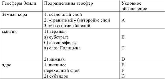 Ближе к ядру расположены слой С (слой Голицына) и нижняя мантия (слой D). Земное ядро, подразделяемое на внешнее ядро (слой Е), переходную зону (слой Е) и субъядро (слой G), имеет радиус 3 500 км.