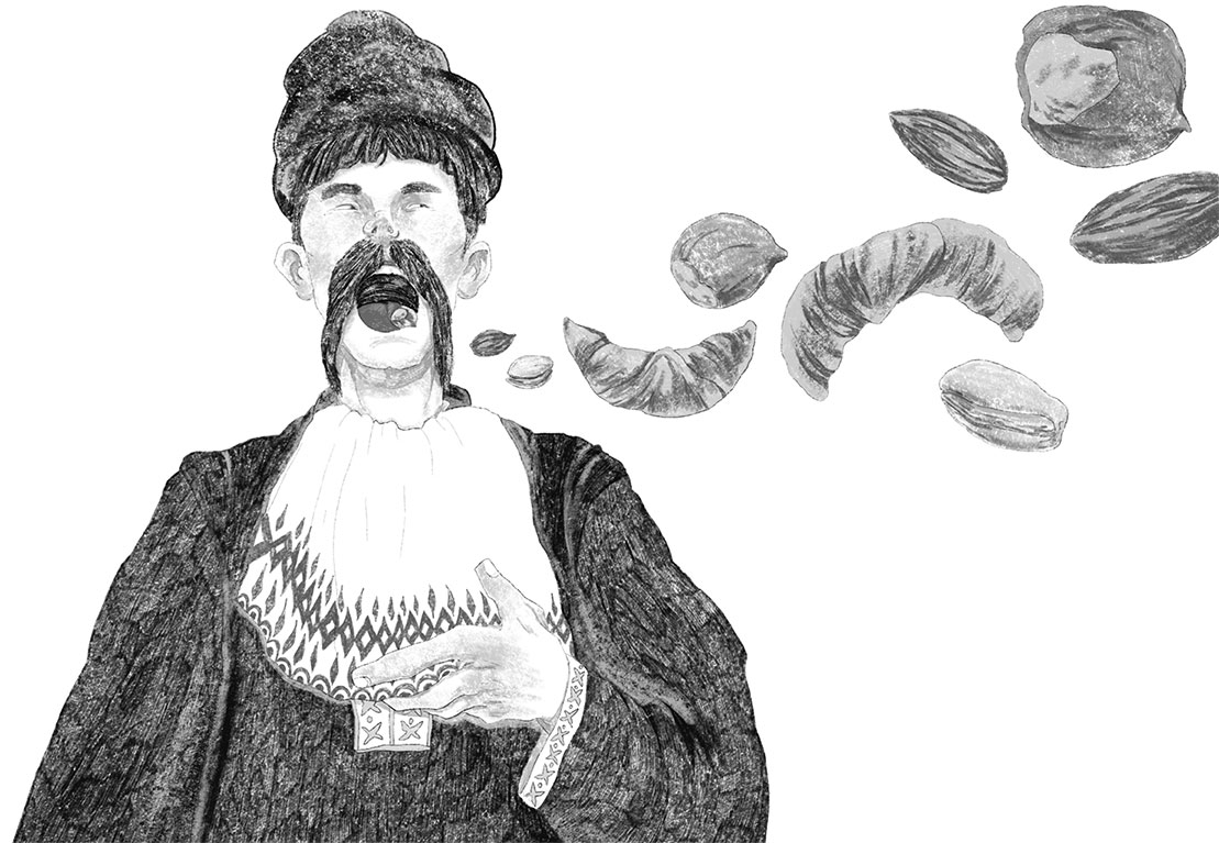Явтух нагнулся к столу и раскрыл рот. В ту же минуту дивные дела произошли в хате. У одного из парней в кармане были припасенные орехи и рожки; вдруг карман раскрылся, и орехи, а там и рожки, будто воробьи, стали вылетать оттуда, направляясь в рот Явтуха, который только раскусывал их. Долго никто не мог придти в себя от изумления. «Э-ге-ге! да что же это такое?» – подумали в один раз все гости и остались неподвижными. Молчание сделалось такое, что слышно было, как муха жужжала и билась где-то под опрокинутым кувшином.