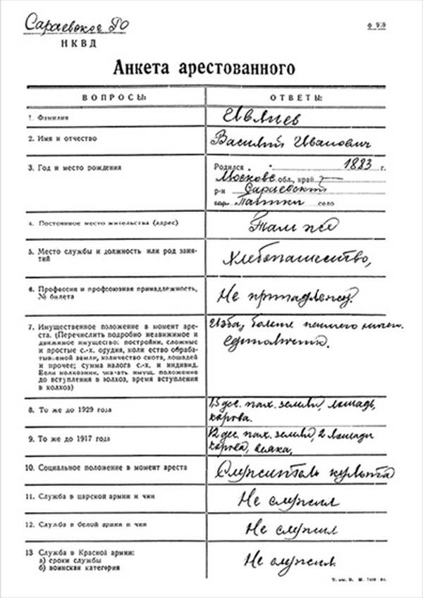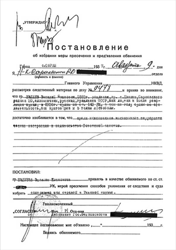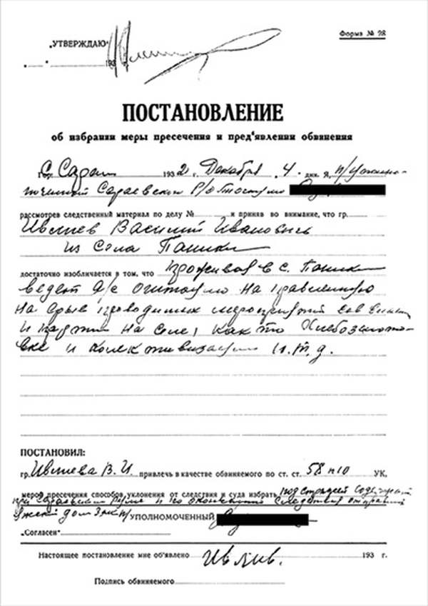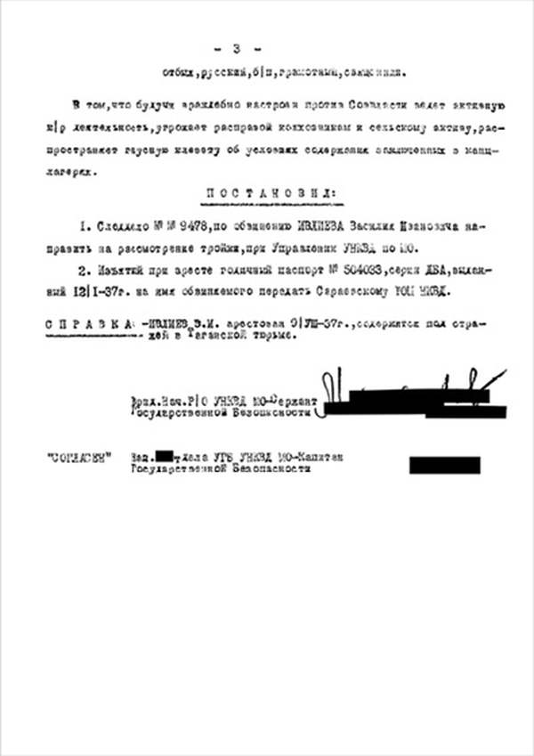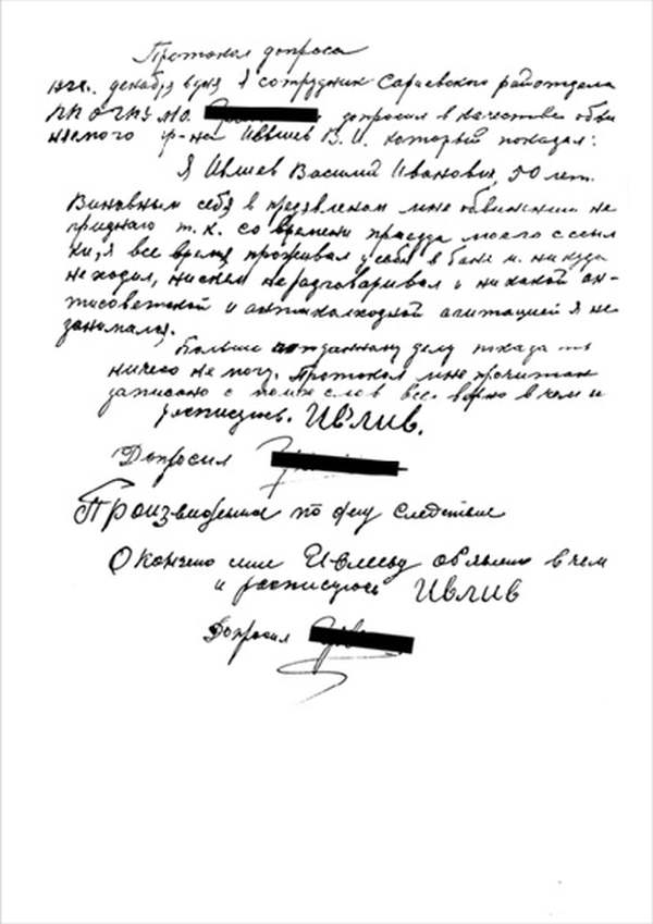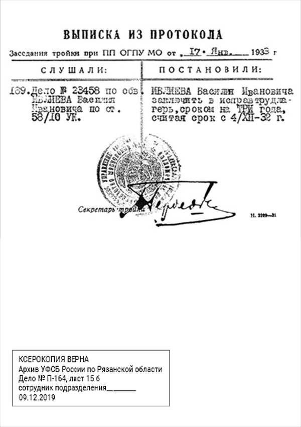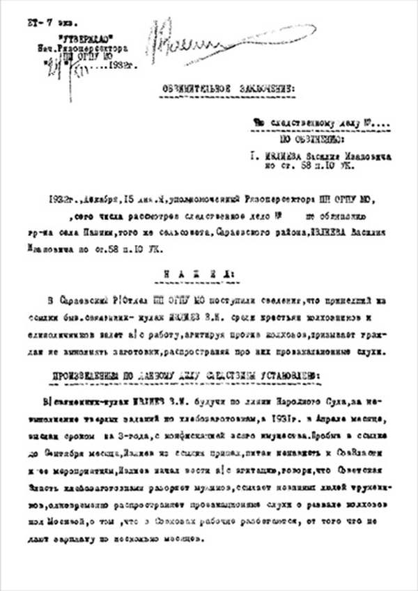 Я, Н-К Сараевского РО ____________ отдела __________ Главного управления __________ НКВД, рассмотрев следственный материал по делу № 9478 и приняв во внимание, что гр. ИВЛИЕВ Василий Иванович, 1883 г. рождения, пр. с. Паники Сараевского района МО, единоличник, русский, гражданин СССР, как до, так и после революции кулак, в 1930 г. судим по ст. 145 УК, в том же году судим за а/с деятельность, был приговорен к 5 годам л/свободы, достаточно изобличается в том, что среди колхозников высказывал террористическое настроение и недовольство властью.
