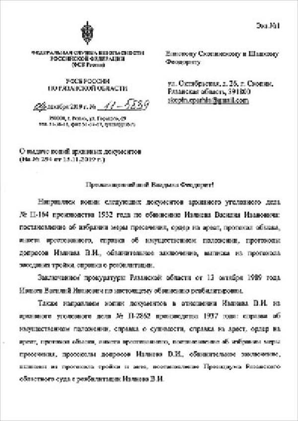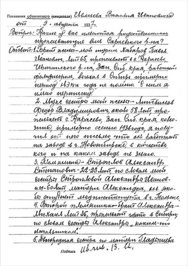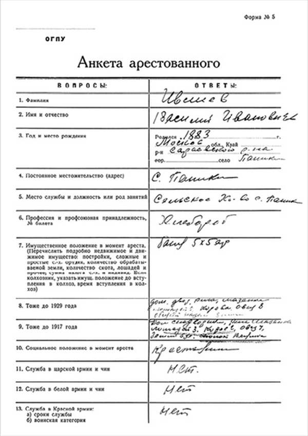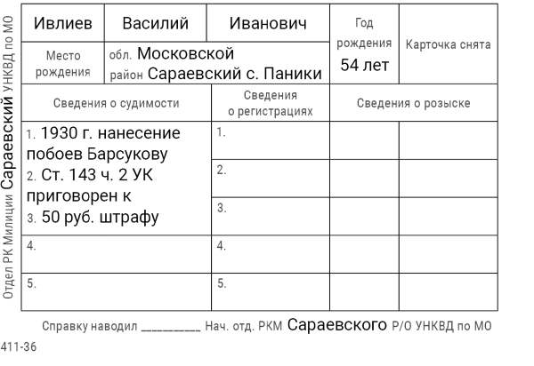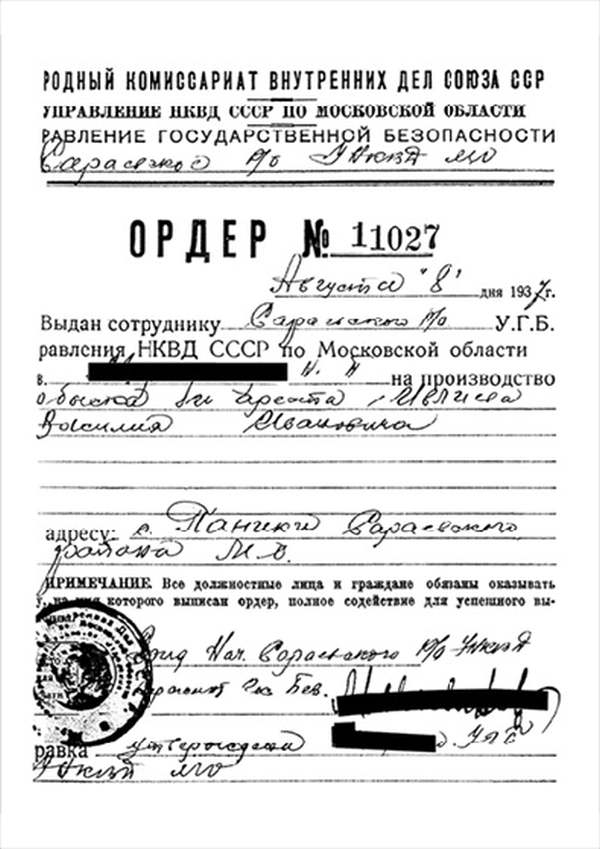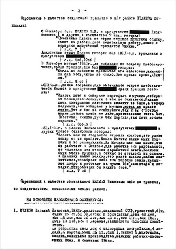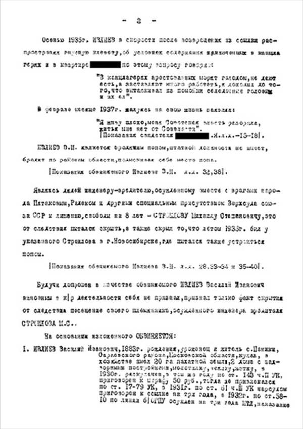 Я, Н-К Сараевского РО ____________ отдела __________ Главного управления __________ НКВД, рассмотрев следственный материал по делу № 9478 и приняв во внимание, что гр. ИВЛИЕВ Василий Иванович, 1883 г. рождения, пр. с. Паники Сараевского района МО, единоличник, русский, гражданин СССР, как до, так и после революции кулак, в 1930 г. судим по ст. 145 УК, в том же году судим за а/с деятельность, был приговорен к 5 годам л/свободы, достаточно изобличается в том, что среди колхозников высказывал террористическое настроение и недовольство властью.