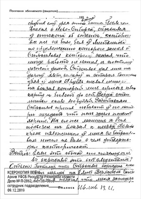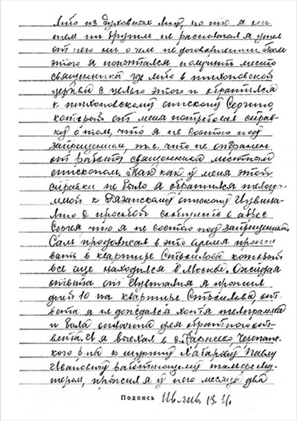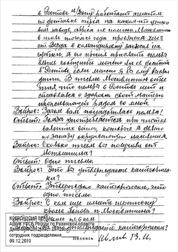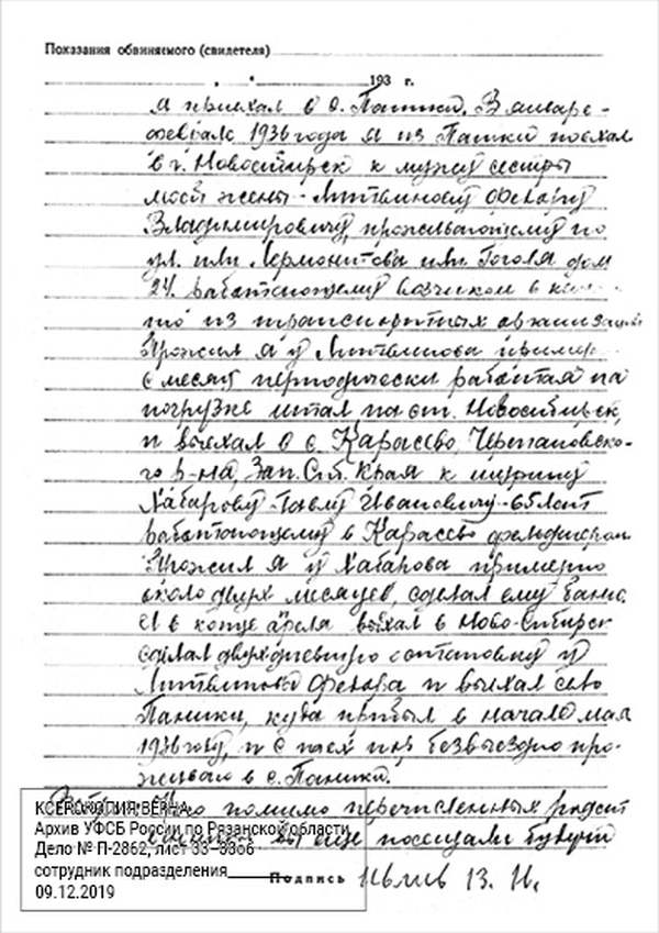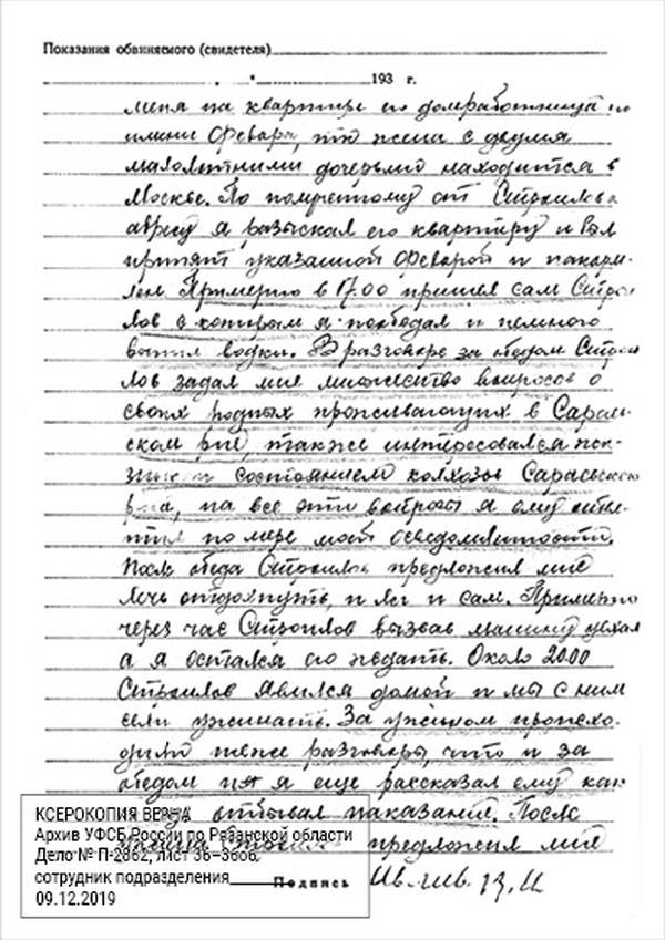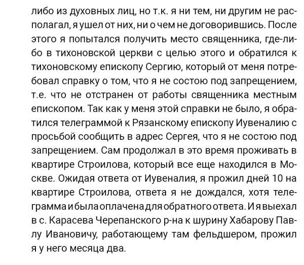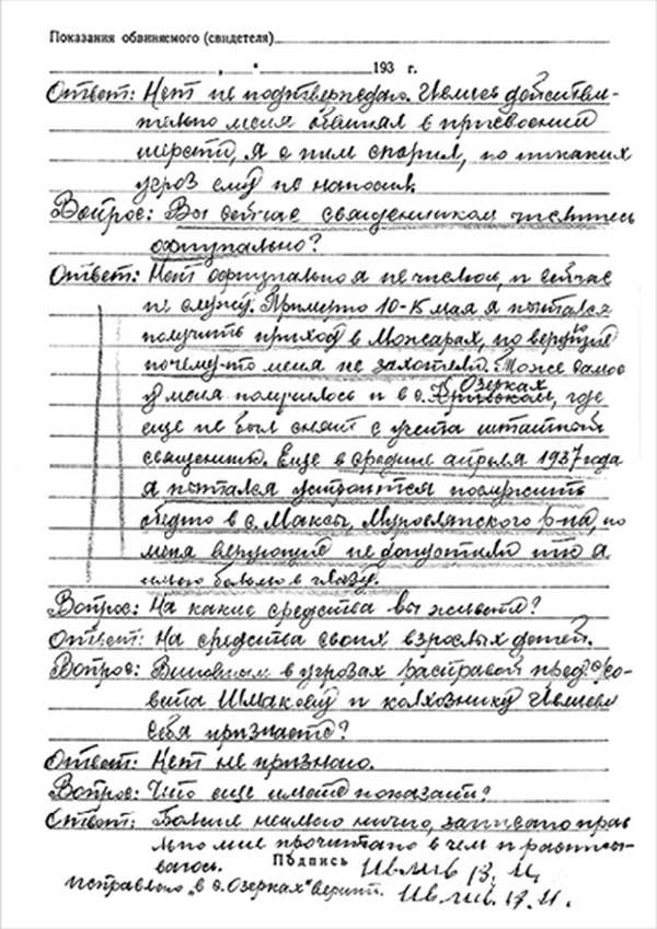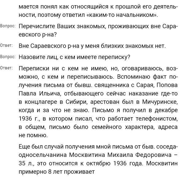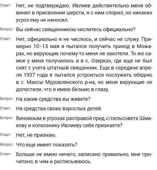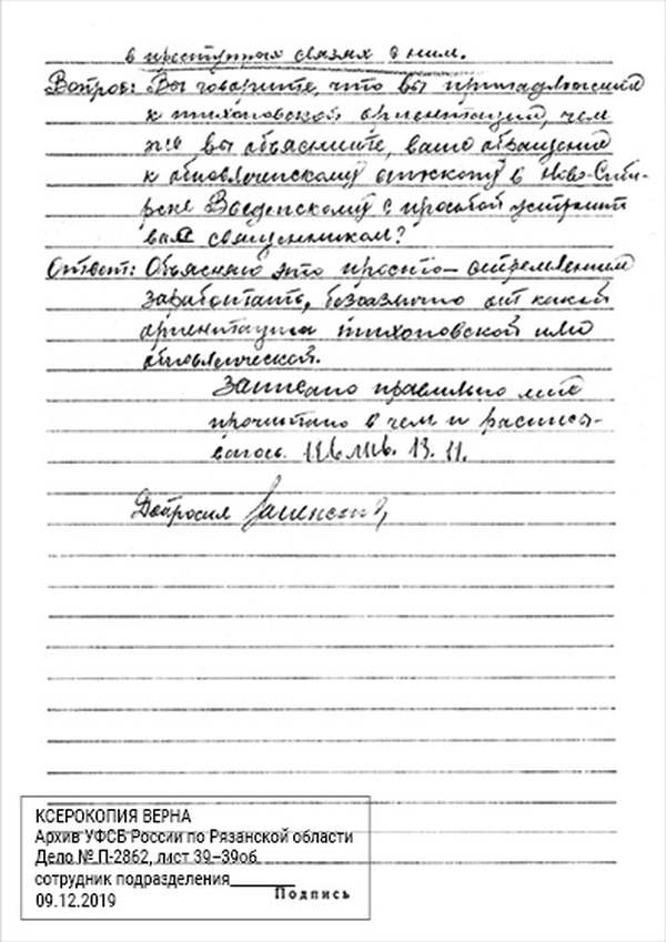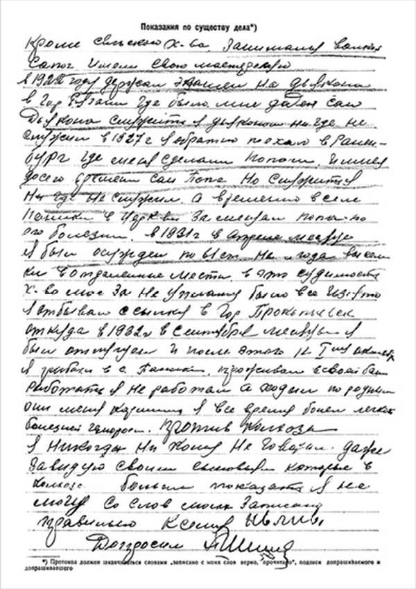 Кроме сельского х-ва занимался валкой сапог. Имели свою мастерскую, в 1922 году держал экзамен на дьякона в гор. Рязани, где был мне дан сан дьякона, служить я дьяконом нигде не служил. В 1927 г. я обратно поехал в Раненбург, где меня сделали попом. Имею до сего времени сан попа. Но служить нигде не служил, а временно в селе Паники в церкви замещал попа по его болезни. В 1931 г. в апреле месяце я был осужден по 61 ст. На 3 года выселен в отдаленные места. В этой судимости х-во мое за неуплату было все изъято. Я отбывал ссылку в гор. Прокопьевск, откуда в 1932 г. в сентябре месяце был отпущен. И после этого к 1му октября я прибыл в с. Паники, проживал в своей бане. Работать я не работал, а ходил по родным, они меня кормили. Я все время болел легкой болезнью геморроя. Против колхоза я никогда никому не говорил, даже завидую своим сыновьям, которые в колхозе. Больше показать я не могу. Со слов моих записано правильно.