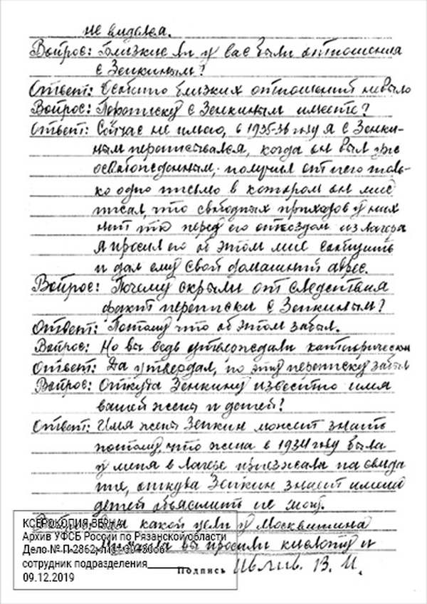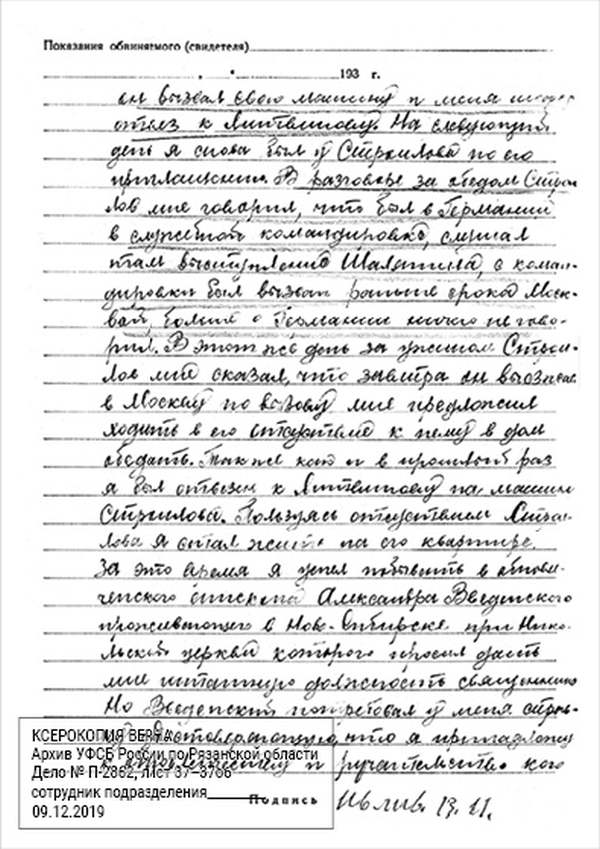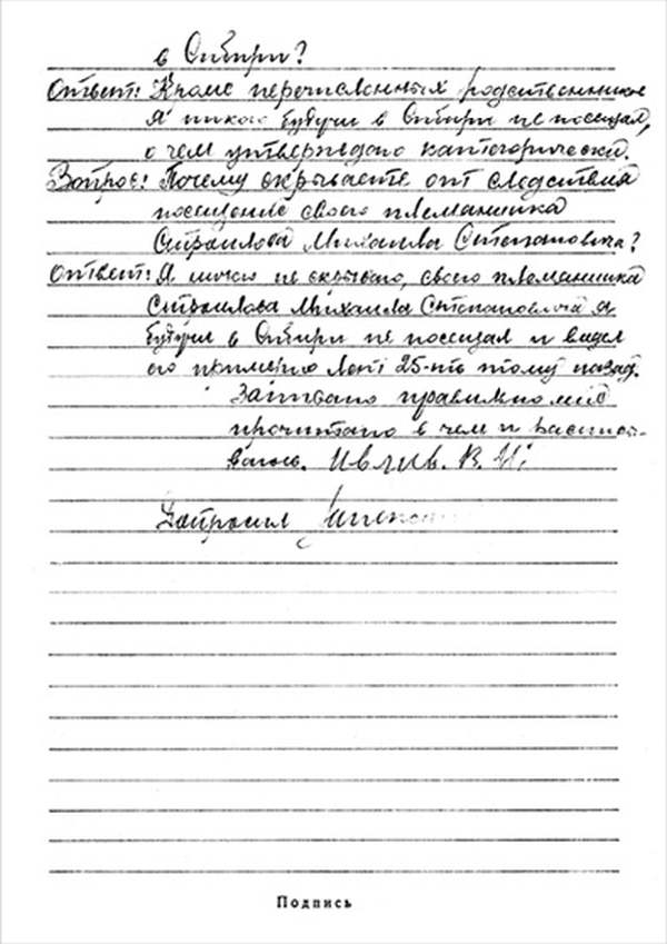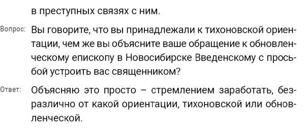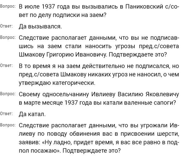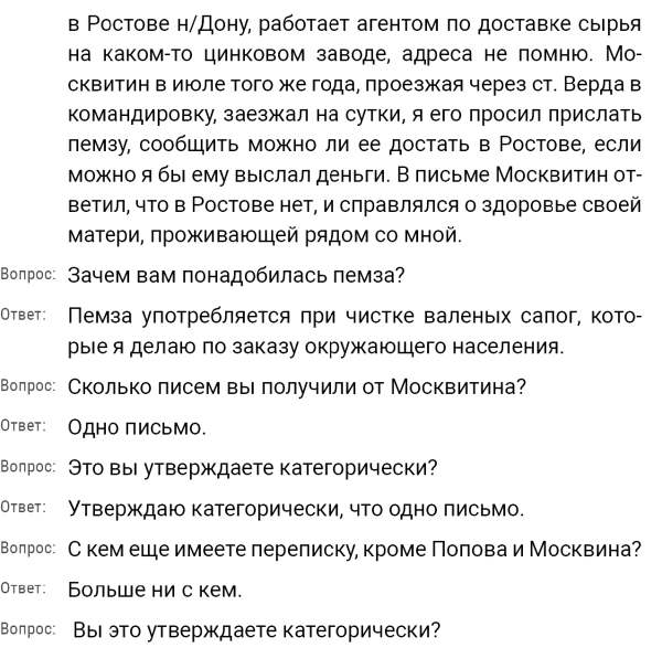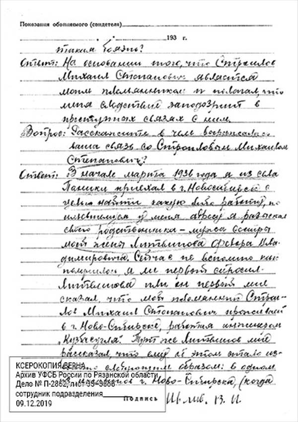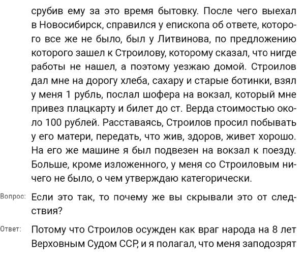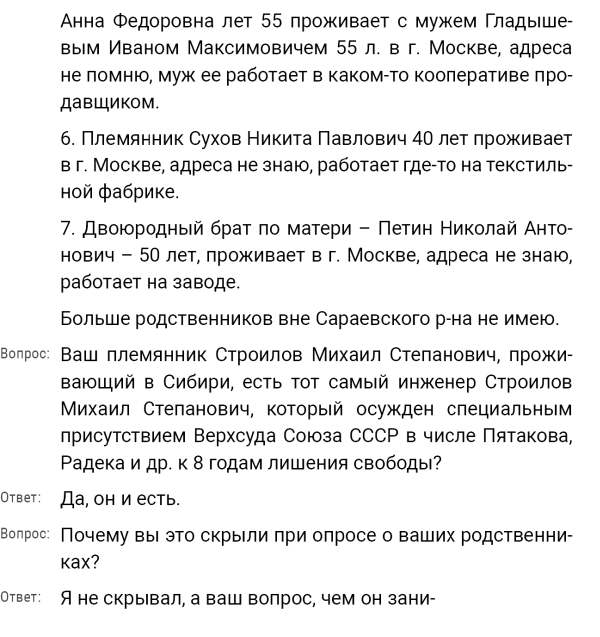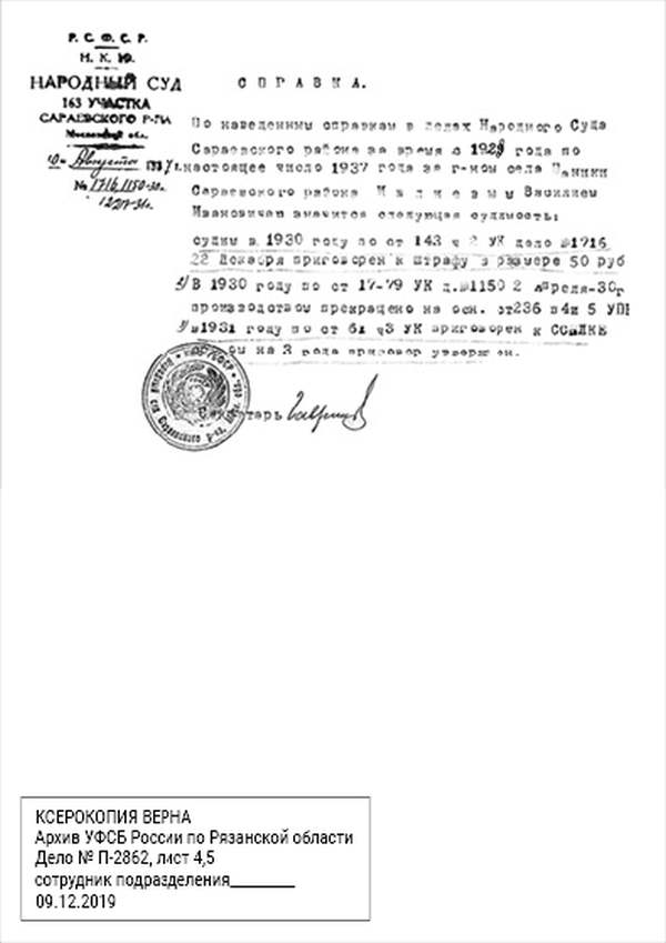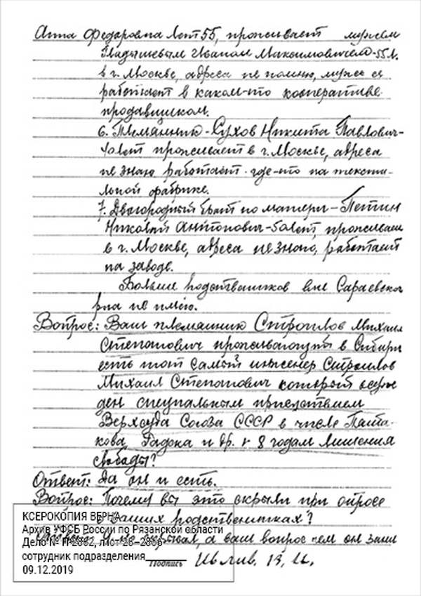 Кроме сельского х-ва занимался валкой сапог. Имели свою мастерскую, в 1922 году держал экзамен на дьякона в гор. Рязани, где был мне дан сан дьякона, служить я дьяконом нигде не служил. В 1927 г. я обратно поехал в Раненбург, где меня сделали попом. Имею до сего времени сан попа. Но служить нигде не служил, а временно в селе Паники в церкви замещал попа по его болезни. В 1931 г. в апреле месяце я был осужден по 61 ст. На 3 года выселен в отдаленные места. В этой судимости х-во мое за неуплату было все изъято. Я отбывал ссылку в гор. Прокопьевск, откуда в 1932 г. в сентябре месяце был отпущен. И после этого к 1му октября я прибыл в с. Паники, проживал в своей бане. Работать я не работал, а ходил по родным, они меня кормили. Я все время болел легкой болезнью геморроя. Против колхоза я никогда никому не говорил, даже завидую своим сыновьям, которые в колхозе. Больше показать я не могу. Со слов моих записано правильно.