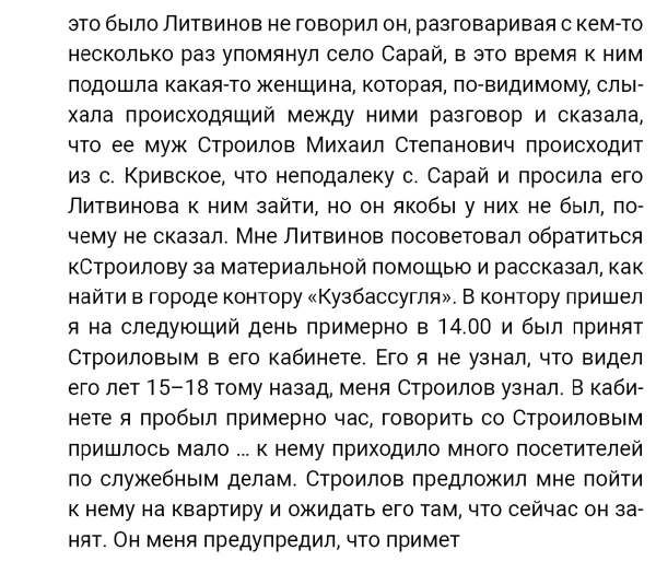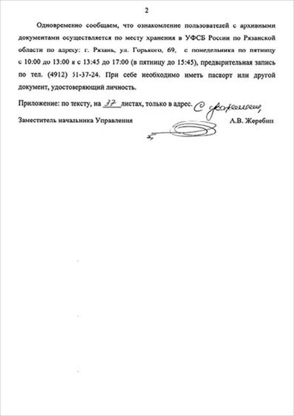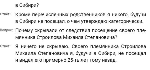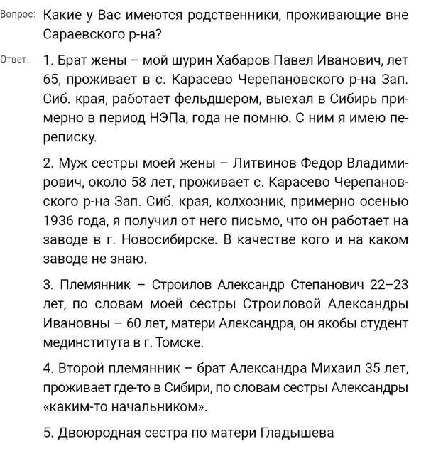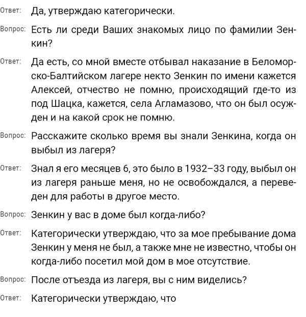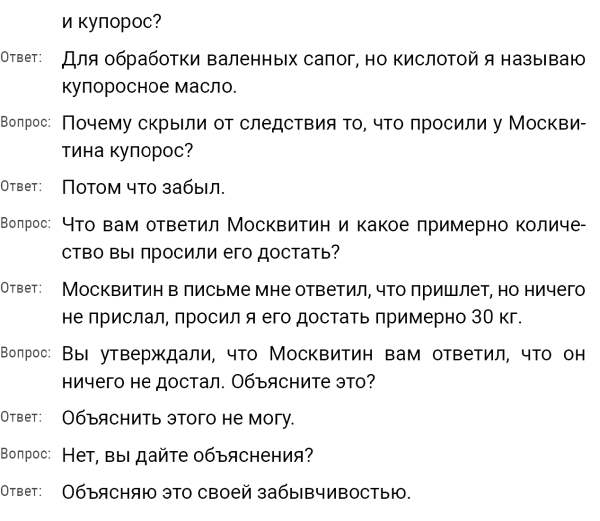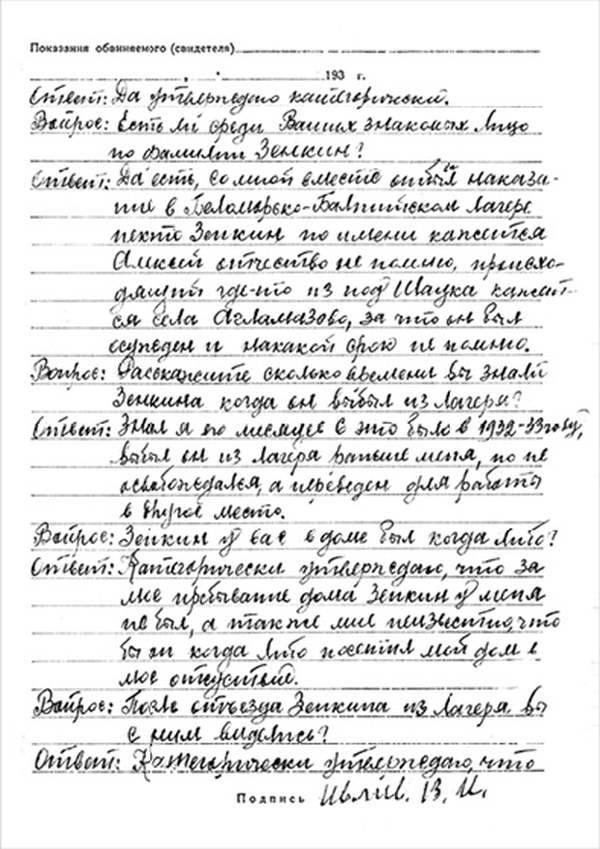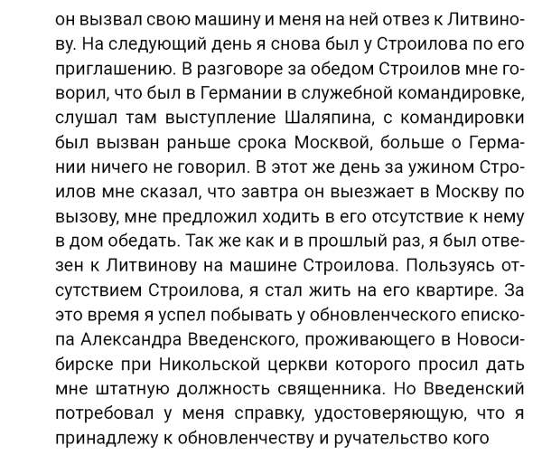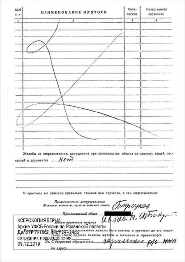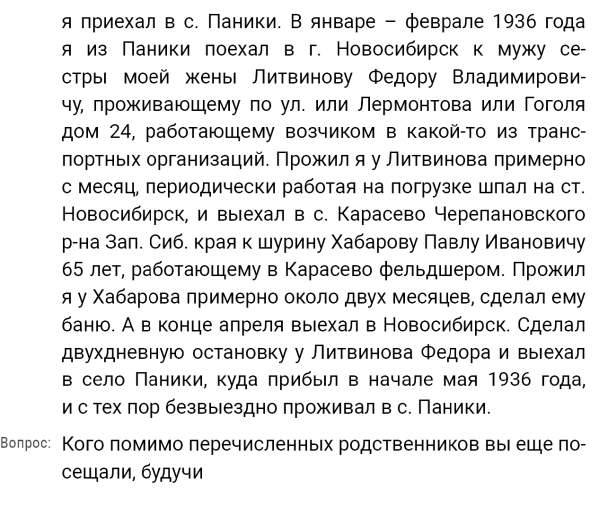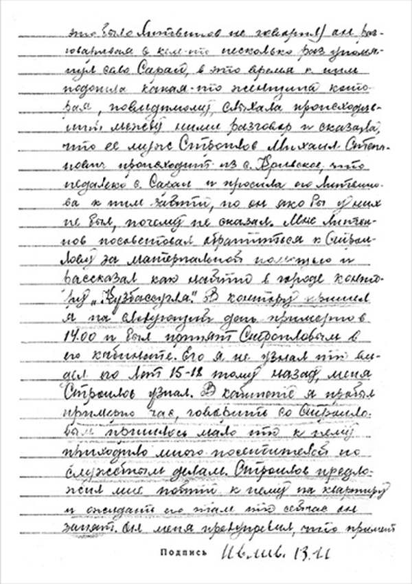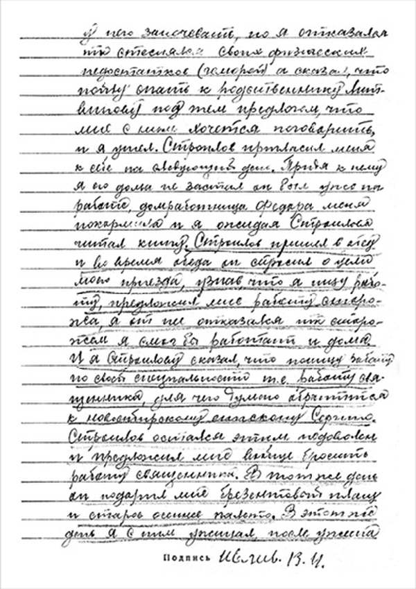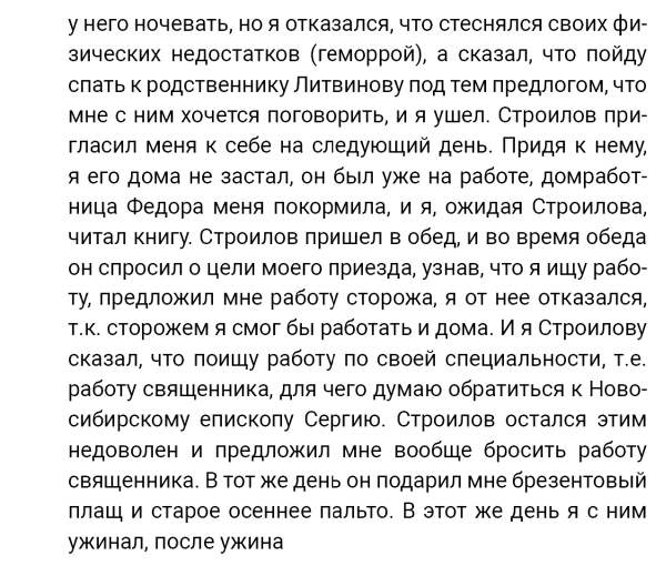 Кроме сельского х-ва занимался валкой сапог. Имели свою мастерскую, в 1922 году держал экзамен на дьякона в гор. Рязани, где был мне дан сан дьякона, служить я дьяконом нигде не служил. В 1927 г. я обратно поехал в Раненбург, где меня сделали попом. Имею до сего времени сан попа. Но служить нигде не служил, а временно в селе Паники в церкви замещал попа по его болезни. В 1931 г. в апреле месяце я был осужден по 61 ст. На 3 года выселен в отдаленные места. В этой судимости х-во мое за неуплату было все изъято. Я отбывал ссылку в гор. Прокопьевск, откуда в 1932 г. в сентябре месяце был отпущен. И после этого к 1му октября я прибыл в с. Паники, проживал в своей бане. Работать я не работал, а ходил по родным, они меня кормили. Я все время болел легкой болезнью геморроя. Против колхоза я никогда никому не говорил, даже завидую своим сыновьям, которые в колхозе. Больше показать я не могу. Со слов моих записано правильно.