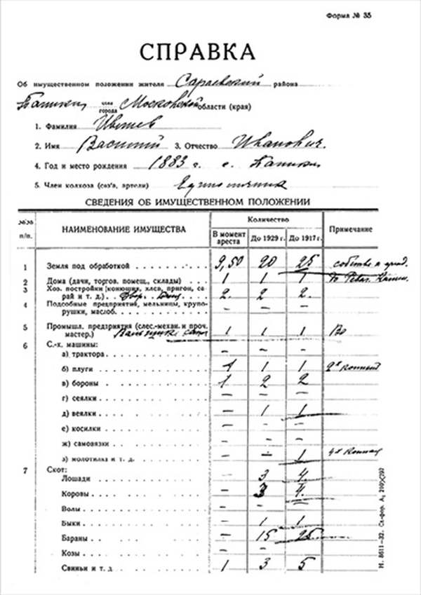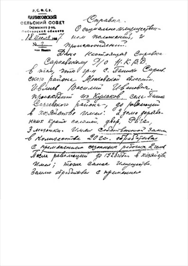 Я, гр-н Ивлиев Василий Иванов[ич]. До революции проживал в с. Паники. Занимался сельским х-вом. Имел: земли четвертной в десяти купчей не было, а брали в аренду у бедноты, по 1 дес. и 2 дес., молотилку ½. Веялку. Лошадей 3, коров 1–2, овец 7, дом дерев. 8 × 8 крыт. надворные постройки. Ригу, мазанку. После Революции в х-ве имелся дом 7 × 7, двор. Рига, мазанка, лошадь 2, коров 1, овец 8. Земли общей надел, аренды не держал, работал своим трудом.