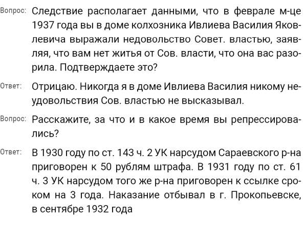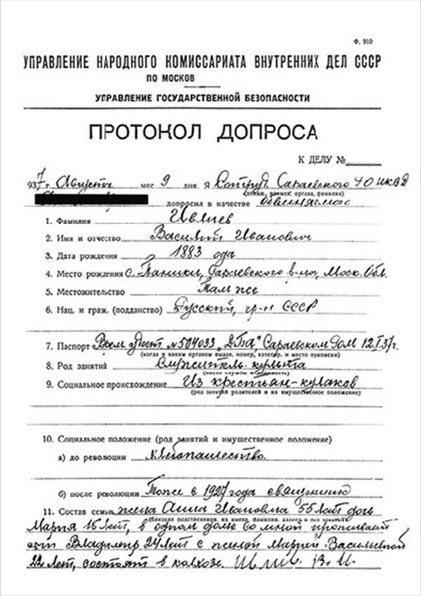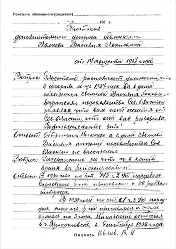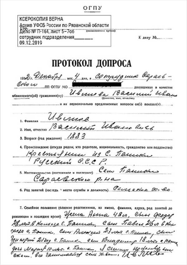 1932 г. декабря мес. 4 дня, я сотрудник Сараевского ПП ОГПУ МО __________, допрашивал в качестве обвиняемого(ой) гражданина(ку) Ивлиева Василия Ивановича и на первоначально предложенные вопросы он(а) показал(а)