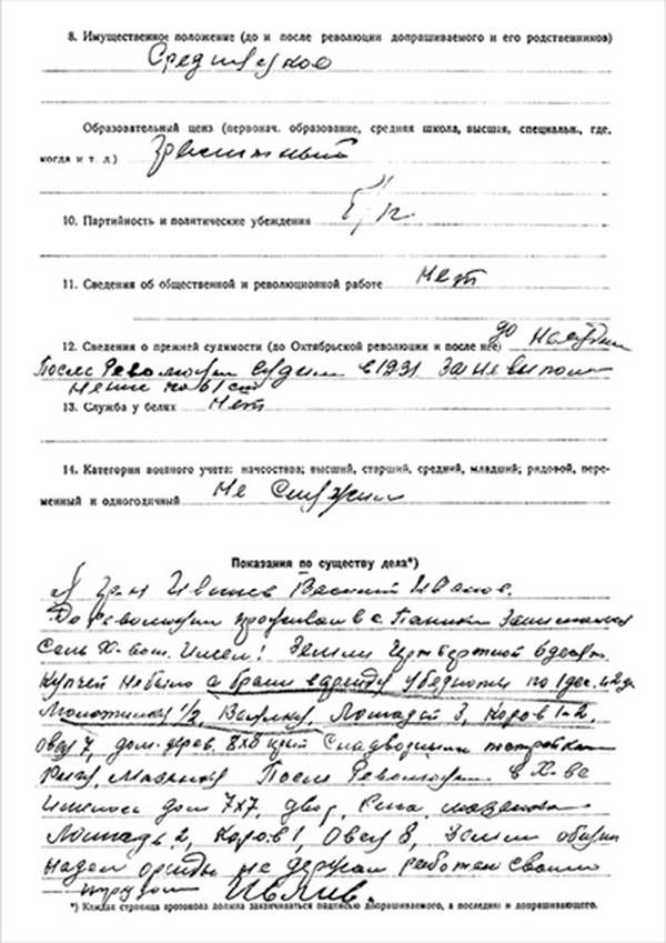 8. Имущественное положение (до и после революции допрашиваемого и его родственников) средняцкое.
