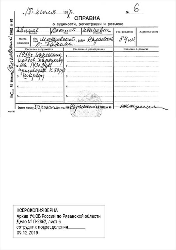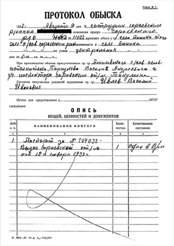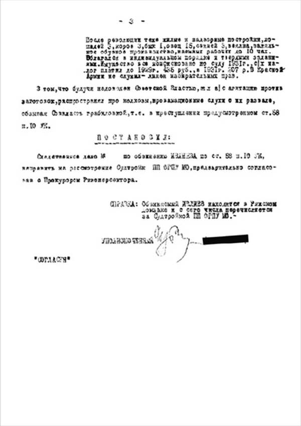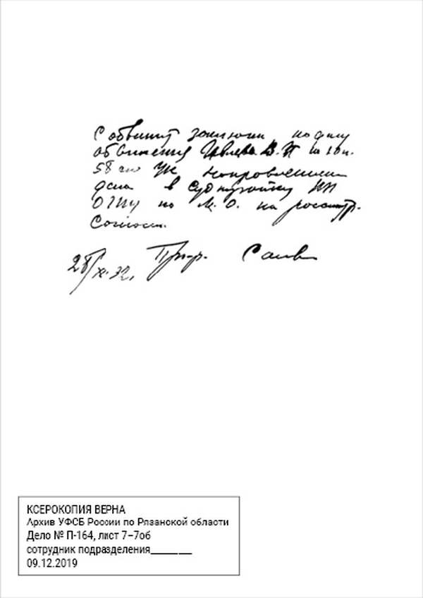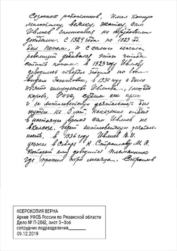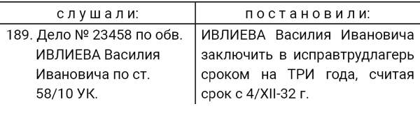 1932 г., декабря 15 дня, уполномоченный Рязоперсектора ПП ОГПУ МО, сего числа рассмотрел следственное дело №… по обвинению гр-на села Паники, того же сельсовета, Сараевского района, ИВЛИЕВА Василия Ивановича по ст. 58 п. 10 УК.