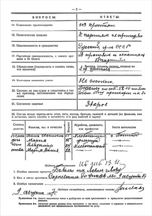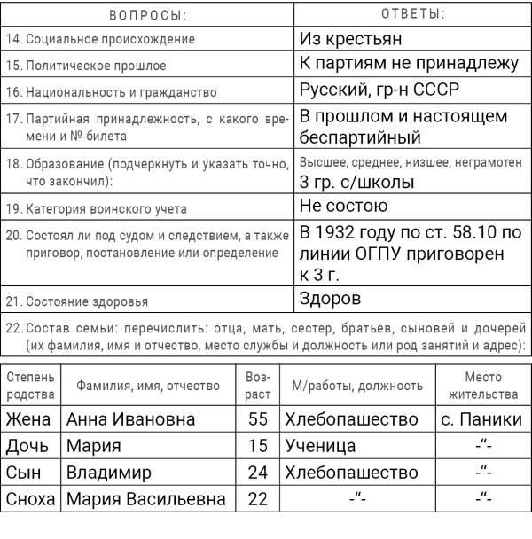 7. Семейное положение (близкие родственники, их имена, фамилии, адреса, род занятий до революции и последнее время) жена Анна 48 л., сын Федор 28 лет, в колхозе с. Паники, сын Павел 26 л., в колхозе с. Паники, сын Алексей 23 лет с. Паники, сын Григорий 21 год с. Паники, сын Владимир 18 лет с. Паники, дочь Мария 10 лет с. Паники. Я с ними не живу ни с кем. Все занимаются сельским хозяйством.