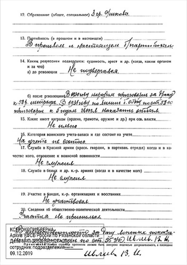 12. Сведения о прежней судимости (до Октябрьской революции и после нее) до ноября. После Революции судим в 1931 за невыполнение по 61 ст.