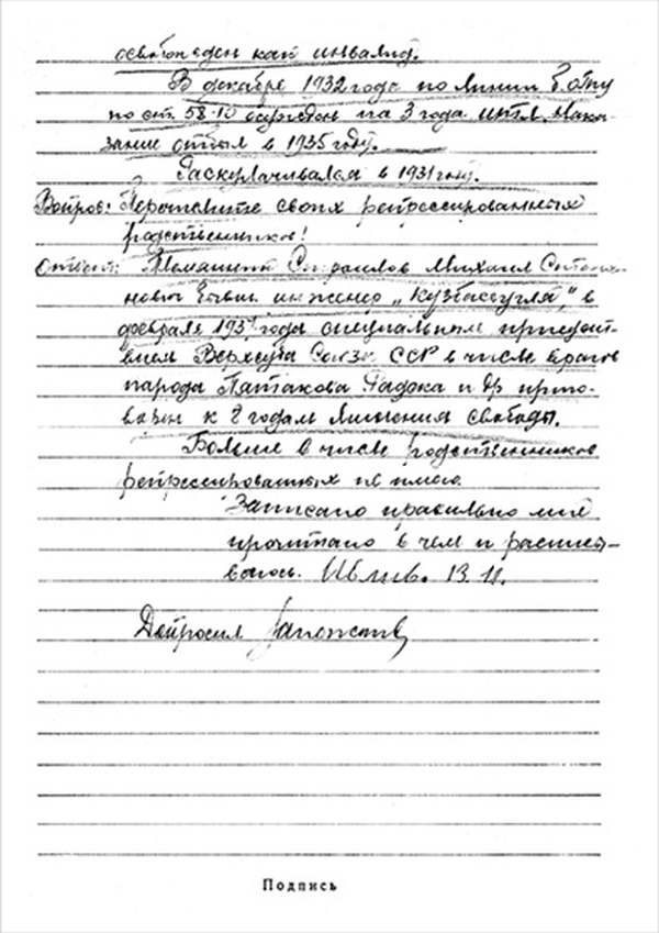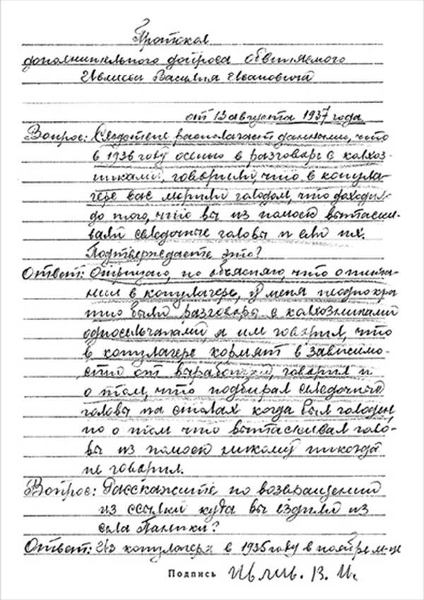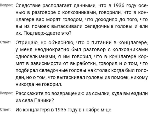 «В концлагерях арестованных морят голодом, не дают есть, а заставляют много работать, и доходит до того, что вытаскивал из помойки селедочные головы и их ел».