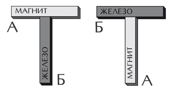 34. Максимум магнитного напряжения – у полюсов магнита. По мере приближения к середине магнита магнетизм ослабевает, в самой же середине величина его равна нулю. Поэтому, если соединить стержни А и Б, как показано на рисунке слева, притяжения между ними не будет; соединенные же, как показано на рисунке справа, они притянутся. Так пловец, плывя к берегу, обнаружил, что магнитом является именно стержень А.