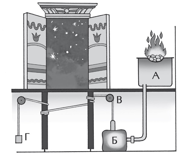 «Чудо» первое – открывающиеся двери. До тех пор, пока в жаровне А не горит огонь, груз Г полностью уравновешен грузиком В, и система блоков, удерживающих дверь, находится в равновесии.