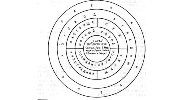 Щит-солнце, высочайше соединяющий функции глаза и зеркала, он запечатлевает весь космос в его основных природных (астральном, божественном, человеческом, зверином) и социальных (война, мир, торговля, земледелие, охота, свадьба) горизонтах. Гефест, его создатель, выковал сюжеты щита, но в эпическом повествовании сцены эти остаются подвижными, ибо щит есть только зеркало вселенского круговращения. Правда, это такое зеркало5151