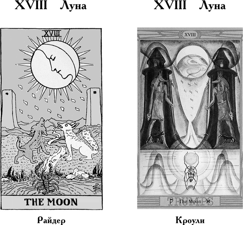 Особое значение в Таро Кроули: Луна указывает на мрачный и болезненный процесс рождения, постепенно наливающийся светом. Карта напоминает: самые темные часы – предрассветные.