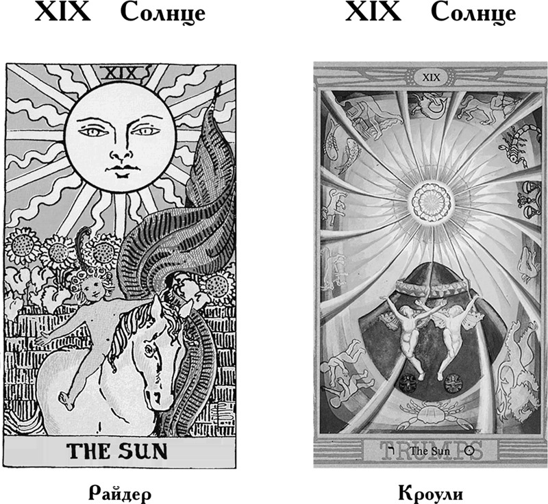 Солнце символизирует все, что мы с ним обычно ассоциируем: веселый нрав, солнечную сторону улицы, отличное настроение, тепло, радость жизни, оптимизм, щедрость. На более глубоком уровне Солнце означает существенный шаг на пути к зрелости – возвращение к простоте (объяснений, жизни и т. д.). Поэтому почти во всех колодах на Аркане Солнца изображены дети, олицетворяющие собой беззаботное отношение, простоту и противоположный Аркану Смерти полюс – смелость и успешное преодоление трудностей. Кроули, рассматривая эту карту, выходит за пределы радости и жажды жизни, он говорит о «переживании» и «проживании» высшего сознания. Рай – как высшее благо, которого мы можем достичь – входит в поле нашего видения. Однако он все еще окружен непроницаемой стеной, сквозь которую не так-то просто пробиться.