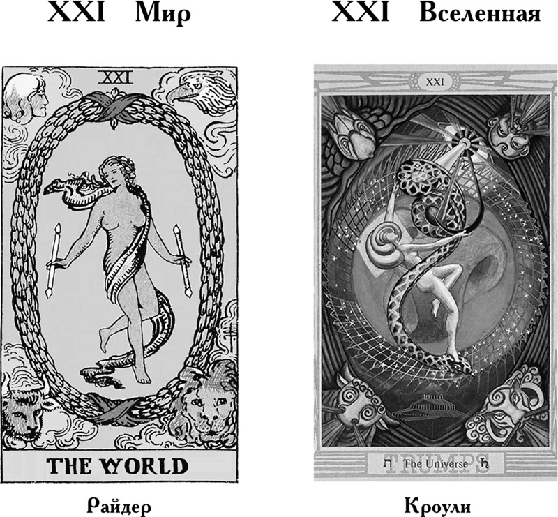 Последняя карта Старших Арканов символизирует конечную цель и ее достижение. Это может быть духовная зрелость, обретение истинного дома, того, к чему мы принадлежим. Во всех случаях данная карта означает радость, счастье, удовлетворение и чувство благодарности. Уэйт делает акцент на полном развитии личности, на радости жизни, в то время как Кроули указывает на примирение, согласие и принятие.