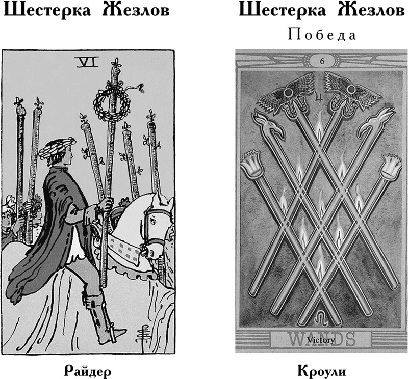 В масти Жезлов такие качества шестерки, как полезность и соединение, говорят о выгодной встрече, благоприятном шансе, который дает судьба и который приведет к победе и успеху. Эту тему символизирует образ вестника, возвещающего о победе. Карта предсказывает какую-то хорошую новость. В Таро Кроули упор сделан на радости и энтузиазме, связанных с ощущением победы. Карта воодушевляет спрашивающего и рекомендует продолжать свой путь.