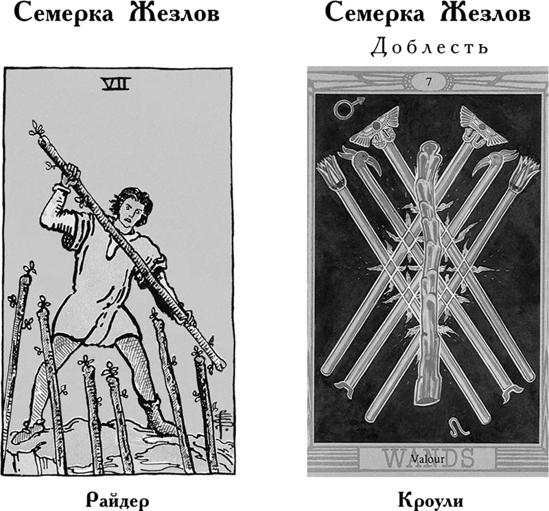 Риск и бойцовское настроение семерки соответствуют желанию и готовности возражать, выражать себя и решительно высказывать свою точку зрения. Также карта указывает на твердое намерение отстаивать свои позиции и при необходимости защищать их. У Райдера это – успех наперекор всем враждебным силам в том случае, если спрашивающий подойдет к делу искренне и решительно. Кроули подчеркивает, что лишь сделав смелый, воистину отчаянный шаг, можно выиграть безнадежное дело.