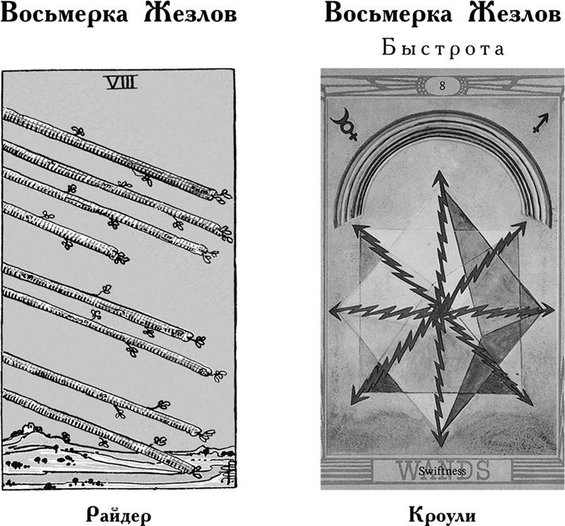 Восьмерка означает перемены, трансформацию и новые начинания. В масти Жезлов она символизирует живость и чрезвычайную быстроту развития событий. В колоде Райдера идея выражена в образе восьми летящих жезлов. Это значит, что нечто – обычно весьма приятное и долгожданное – уже «созрело» и очень скоро «упадет» прямо к вам в руки. Это может быть гениальная идея, новость, событие или письмо. В Таро Кроули послание принимает форму озарения, ментальной гибкости.