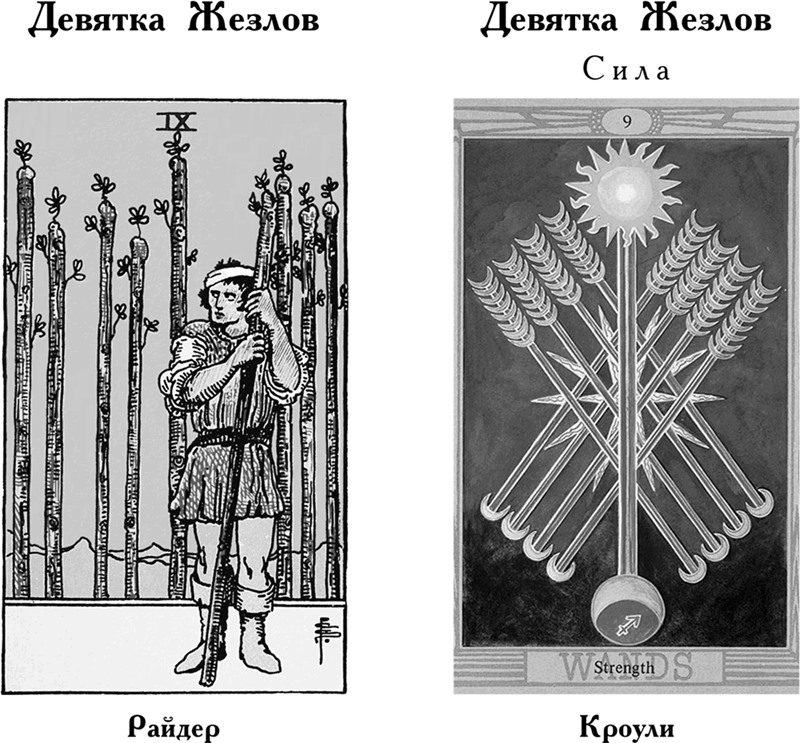 В масти Жезлов девятка проявляет такие качества, как стремление собираться воедино, проявление силы и решительный настрой. Это легко может перейти в сдержанность и осторожность, как показано на карте Райдера – Уэйта. Однако карта ничего не говорит о том, оправдана ли осторожность в данной ситуации или нет. В любом случае подразумевается отсутствие какой бы то ни было опасности; боязнь чего-либо базируется на воспоминаниях о прошлых неприятностях. Таким образом, карта Уэйта предлагает проверить реальность угрожающей опасности, возможно, это всего лишь плод вашего воображения.
