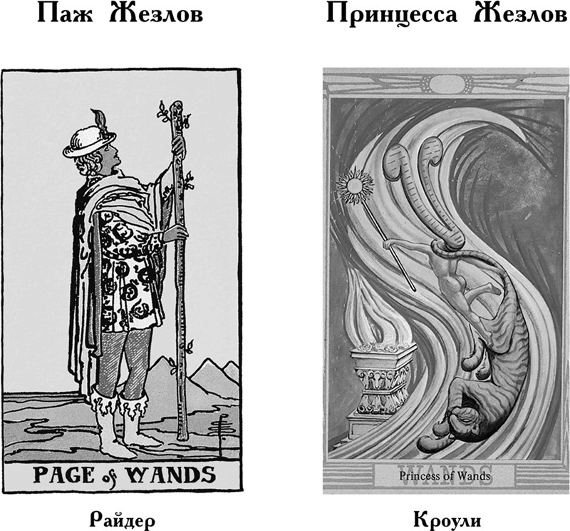 Паж олицетворяет собой возможности, открывающиеся спрашивающему на его жизненном пути. Огненный импульс, нацеленный на ваш темперамент и вдохновение, – вот значения этой карты. Воздух искрится от напряженного ожидания, спрашивающий стоит перед искушением или перед вызовом. Карта Райдера говорит о позитивности этого импульса и через образы жезла и пирамид обращает внимание спрашивающего на нечто огненное и экзотичное. Кроули же смещает акцент трепетного ожидания в сторону сексуальности и страсти. Однако это не значит, что Принцесса Жезлов не может символизировать другие возможности и интересы, встающие перед спрашивающим и бросающие ему вызов.