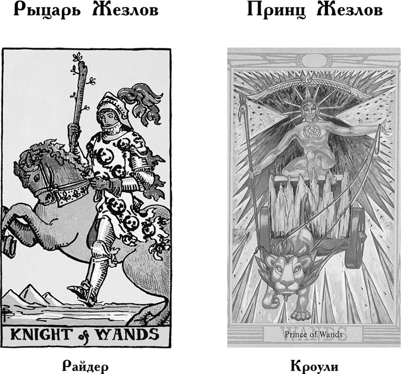 Рыцари олицетворяют настроение, царящую атмосферу. Рыцарь Жезлов символизирует южный ветер, несущий долгожданное тепло. В то же время его прибытия ожидают с некоторой опаской, поскольку он может уничтожить урожай. В Таро Райдера эта карта говорит о пламенности, нетерпении и жажде приключений, а также о прекрасном расположении духа и жизнелюбии. Однако в некоторых случаях это всего лишь показуха, пускание пыли в глаза, «разжигание страстей». Кроули придает Принцу Жезлов то же значение, но делает акцент на страстности натуры и на желании завоевывать новые территории.