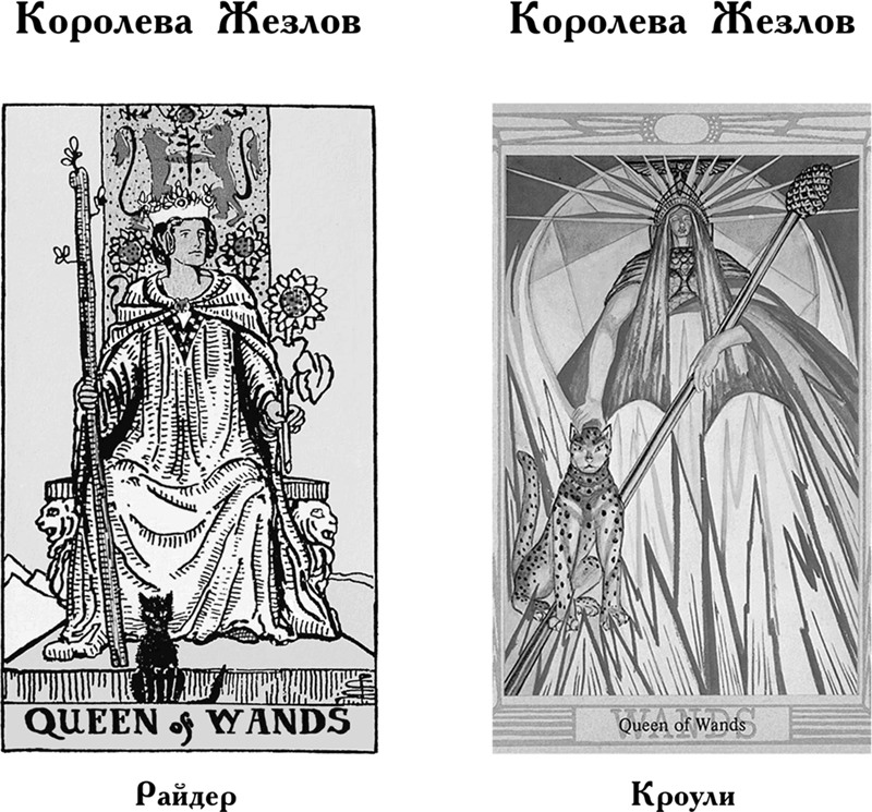 Королева Жезлов указывает на женский аспект стихии огня. Она вдохновенна и готова к ситуациям, в которых требуется проявить смелость, инициативу или пойти на риск, к разного рода авантюрам и приключениям. Таро Райдера отмечает уверенность в себе, ум и деятельность (зачастую она – предпринимательница или начальница). Кроули делает упор на ее темперамент и страсть.
