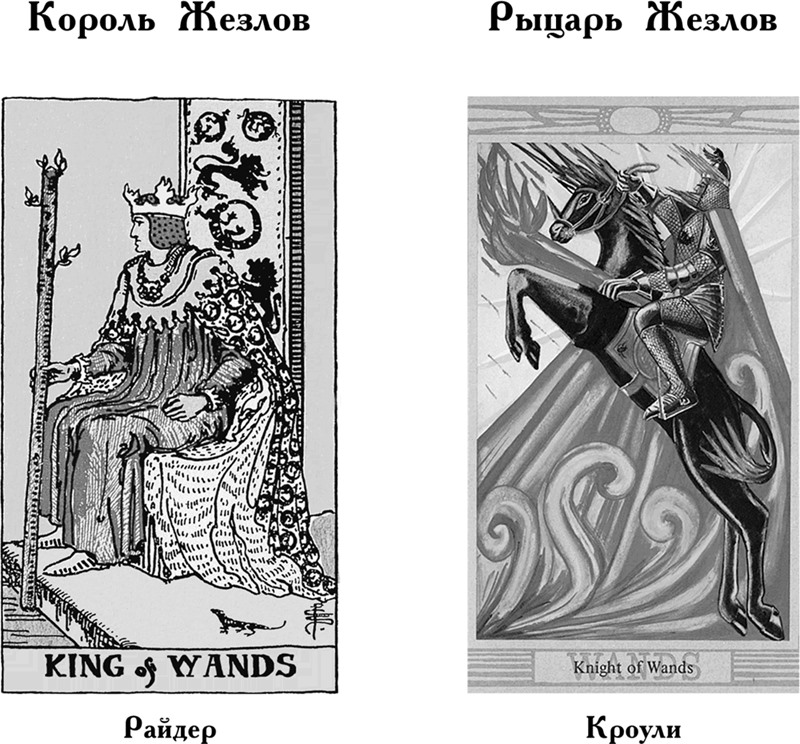 Король Жезлов указывает проявление мужского начала в стихии огня, знаменует силу, волю, динамичность, инициативу и способность вдохновлять и мотивировать окружающих. Это и пылкий нрав, и дух предпринимательства, и готовность пойти на риск, и жизненная энергия. Таро Райдера отмечает ум, зрелость, харизму и щедрость. Примерно то же самое находим у Кроули, в его карте на первый план выходят творчество, динамика и стремление к возвышенным идеалам.