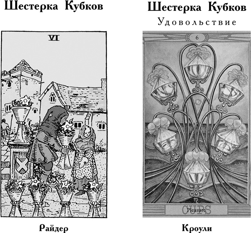 Цифра шесть символизирует полезность и стремление к единению. В масти Кубков это выражается гармонично сбалансированным потоком чувств. Таким образом, карта говорит о радости, удовлетворении и прекрасном настроении. В Таро Райдера она указывает на ностальгические переживания, пробуждение давно забытых желаний, намерений и планов. Главный акцент делается на воодушевлении и вдохновении, которыми наполняется человек, вспоминая что-то хорошее.