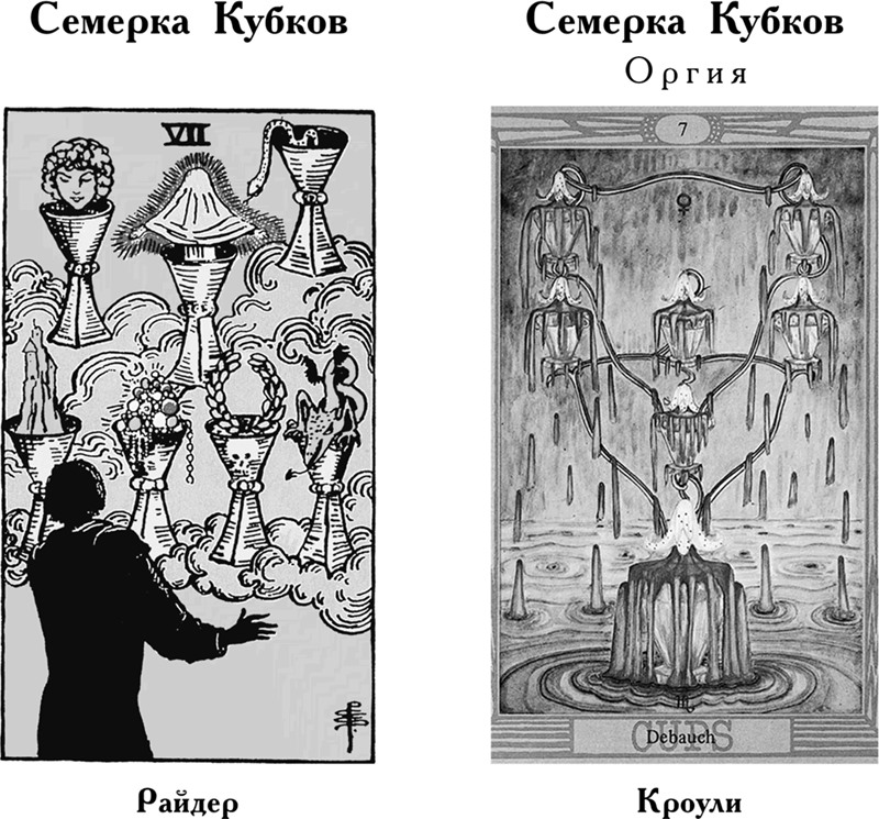 В масти Кубков рискованный характер семерки предстает в виде опасности увлечься иллюзиями, начать погоню за миражом. Иногда Семерка Кубков символизирует мечту, но чаще всего она говорит о пустых фантазиях и обмане. В редких случаях карта побуждает спрашивающего дать волю своему воображению и помечтать. Гораздо чаще она советует не принимать желаемое за действительное, не поддаваться бесплодным надеждам и не уходить от реальной действительности. Таро Райдера ставит иллюзорный аспект на первое место, но с оговоркой: если спрашивающий не поддастся соблазну и четко определит свои позиции и цели, то он может рассчитывать на помощь. Кроули говорит об ошибочном выборе пути, опасности самообмана, связывая это с пристрастиями и зависимостью.