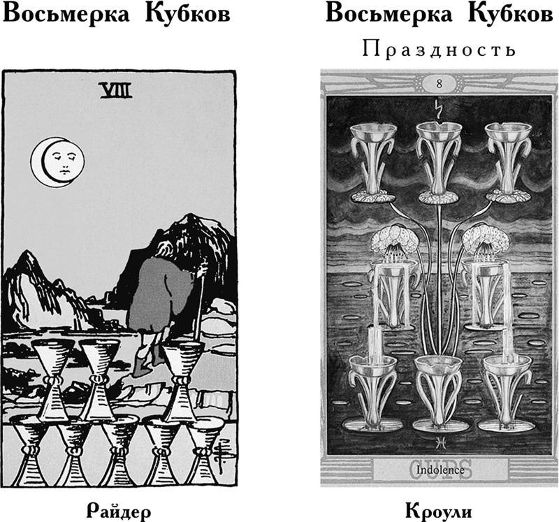 Восьмерка – цифра трансформации, в масти Кубков она означает прощание с чем-то знакомым и привычным, уход в неведомое. На карте Райдера изображены восемь кубков, указывающих на нечто значимое, которое придется оставить позади. Карта не говорит, является ли это чем-то дорогим или всего лишь ежедневной рутиной, из сетей которой не так просто вырваться. Дорога сквозь темное ущелье, озаренное лунным светом, указывает на неуверенность, которую испытывает уходящий. В то же время красная одежда говорит о свободном выборе. Вы уходите по собственной воле, а не как изгнанник. Возможно, вам просто не осталось ничего другого.