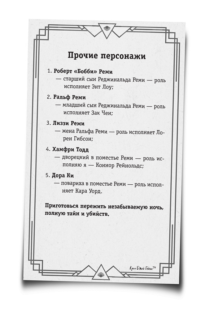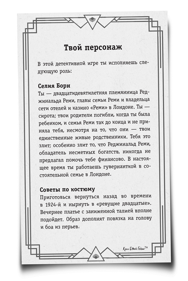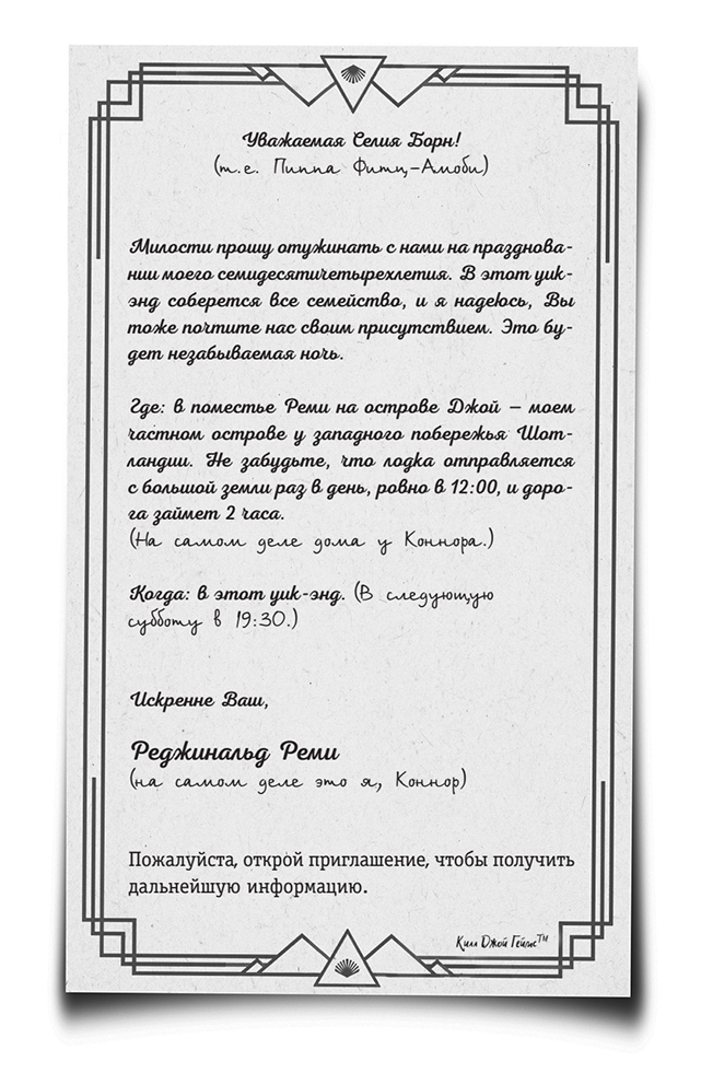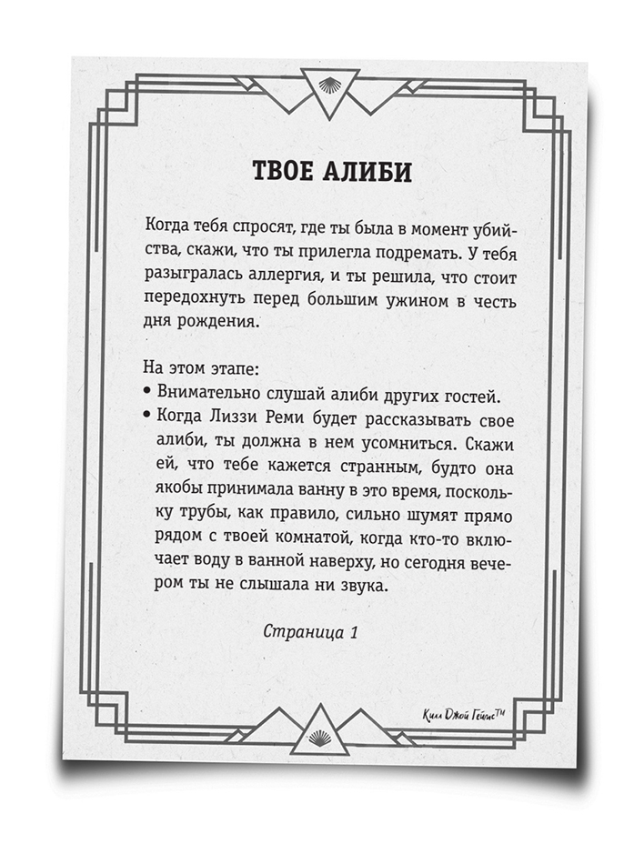 Пиппа устроилась на стуле. Справа от тарелки она заметила брошюрку, на которой было напечатано название – «Килл Джой Геймс – Убийство в поместье Реми», а также ее имя – Селия Борн.