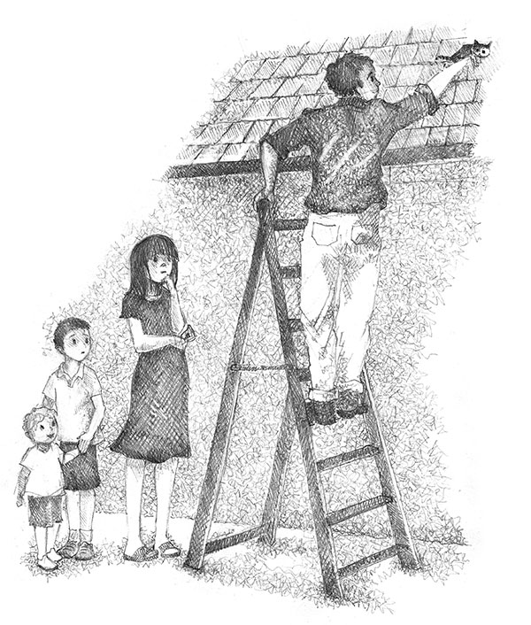 – Нет! Сейчас я всё объясню, – пообещал мальчик и помчался вниз по лестнице. Он выбежал на улицу и осторожно приблизился к гаражу. – Слезь оттуда, пожалуйста, – прошептал Джордж, глядя на котёнка. – Я не хочу, чтобы ты упала.