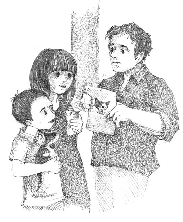 – Что ж, она в порядке, как я вижу. – Он взглянул на рыжую шёрстку с чёрными и белыми пятнами и нахмурился: – Интересно… Но это же далеко. Подержи её, пожалуйста. – Он передал кошечку Джорджу и порылся в кармане. – Как думаете, похожа? – обратился он к мальчику и его маме, демонстрируя им фотографию котёнка на мятой листовке.