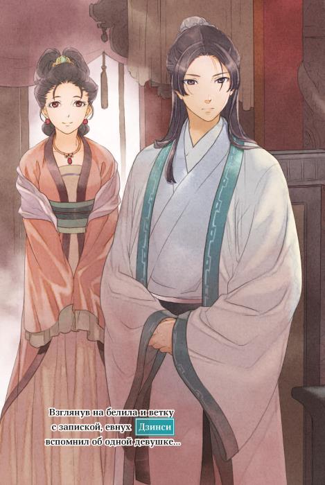 Во дворце императорских жен вспыхнуть любви почти негде и не к кому, и нередко дворовые девы до того отчаиваются, что даже евнухи, в которых от мужчины уже ничего не осталось, заставляют трепетать их сердце. Тут и там до Маомао доходили слухи о том, как очередная служанка, отслужив положенный срок, выскакивала замуж за евнуха. Сама Маомао считала, что для женщин даже такое лучше и полезнее для здоровья, чем единолично заниматься непотребствами. И все равно любовь к евнуху казалась ей странной…