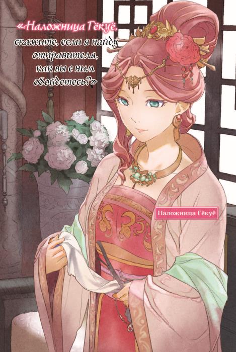 По властному голосу и одеждам Маомао поняла, что госпожа, разразившаяся бранью, есть не кто иная, как самая могущественная женщина во дворце императорских жен. Несомненно, то была наложница Лихуа, мать наследного принца. Та же, кто стояла, виновато склонив голову, была второй любимой наложницей императора, звали ее Гёкуё, и она родила государю дочь. Девы-чиновники, суетившиеся рядом, приходились госпожам личными служанками, а тот, кто силился всех урезонить, явно служил во дворце лекарем. О последнем господине, ставшем для этой службы евнухом, Маомао ничего толком не знала, но слышала, что во всем огромном дворце императорских жен лишь он один врачует.
