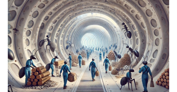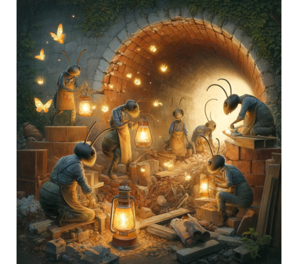 Разведчики хотели было уже возвращаться назад, когда вдруг в ответвлении одного из проходов, в самом его конце, заметили свет и услышали доносящиеся отдалённые звуки. Тогда, направившись на свет, отряд скоро вышел к месту, которе было не столь внешне удручающим и даже казалось вполне живым. Тут сновали муравьи, велись какие то работы и даже горело освещение. Появление вооруженных чужаков однако, никого не насторожило и муравьи продолжали заниматься своими делами как ни в чём не бывало.