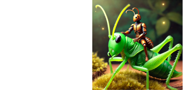 Надо сказать, езда на кузнечике, дело достаточно непростое. Без специальной выучки и сноровки мало кто может вот так, сразу, проскакать на этом ретивом насекомом. Кроме мощных задних ног, коими кузнечик отталкивается от земли словно пружинами, у него есть ещё две пары крыльев сложенных вдоль спинки. По этому, управлять им ещё сложнее, чем человеку скачущим конём. Если к примеру надо преодолеть расстояние относительно небольшое, то достаточно использовать лишь одни задние, толчковые ноги. Если же расстояние большое и предстоит долгий путь, то наездник управляя кузнецом заставляет выпускать того после каждого прыжка крылышки, тем самым увеличивая дальность прыжка за счёт планирования.